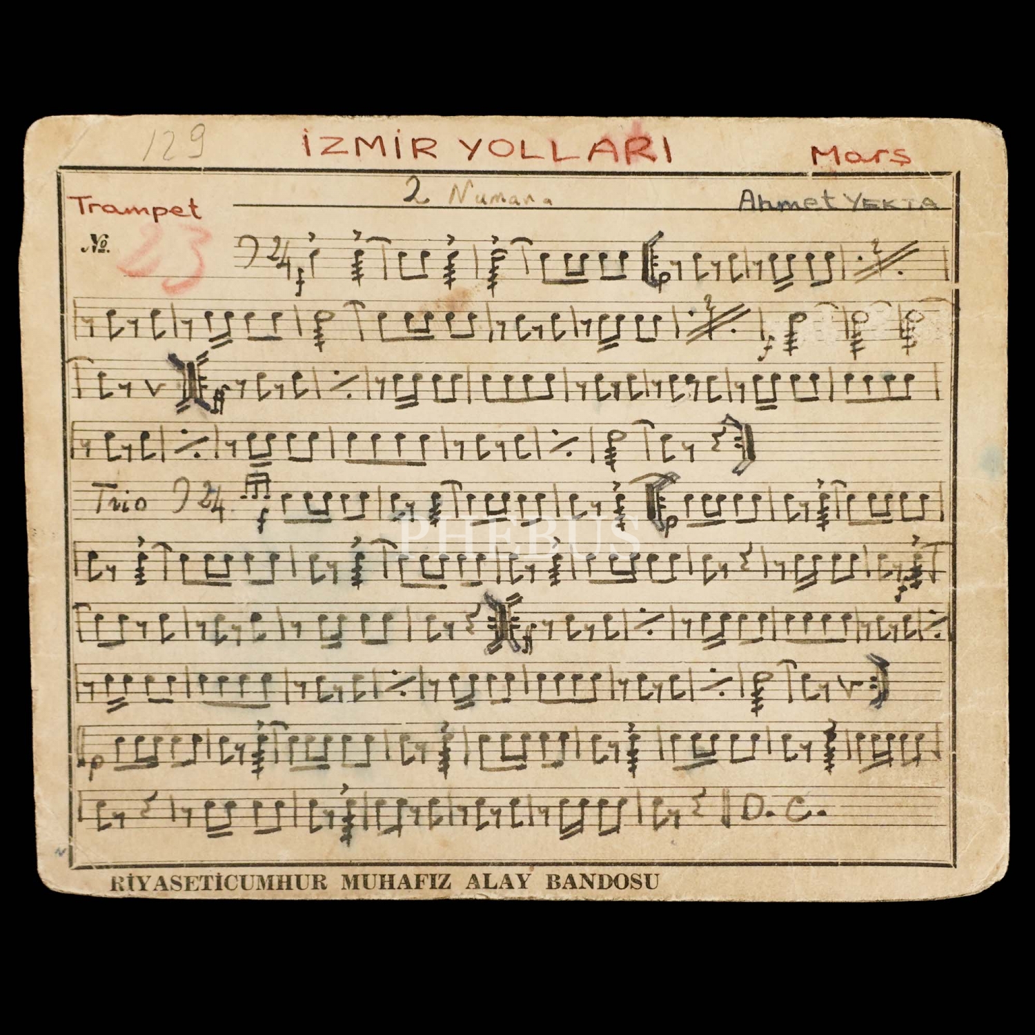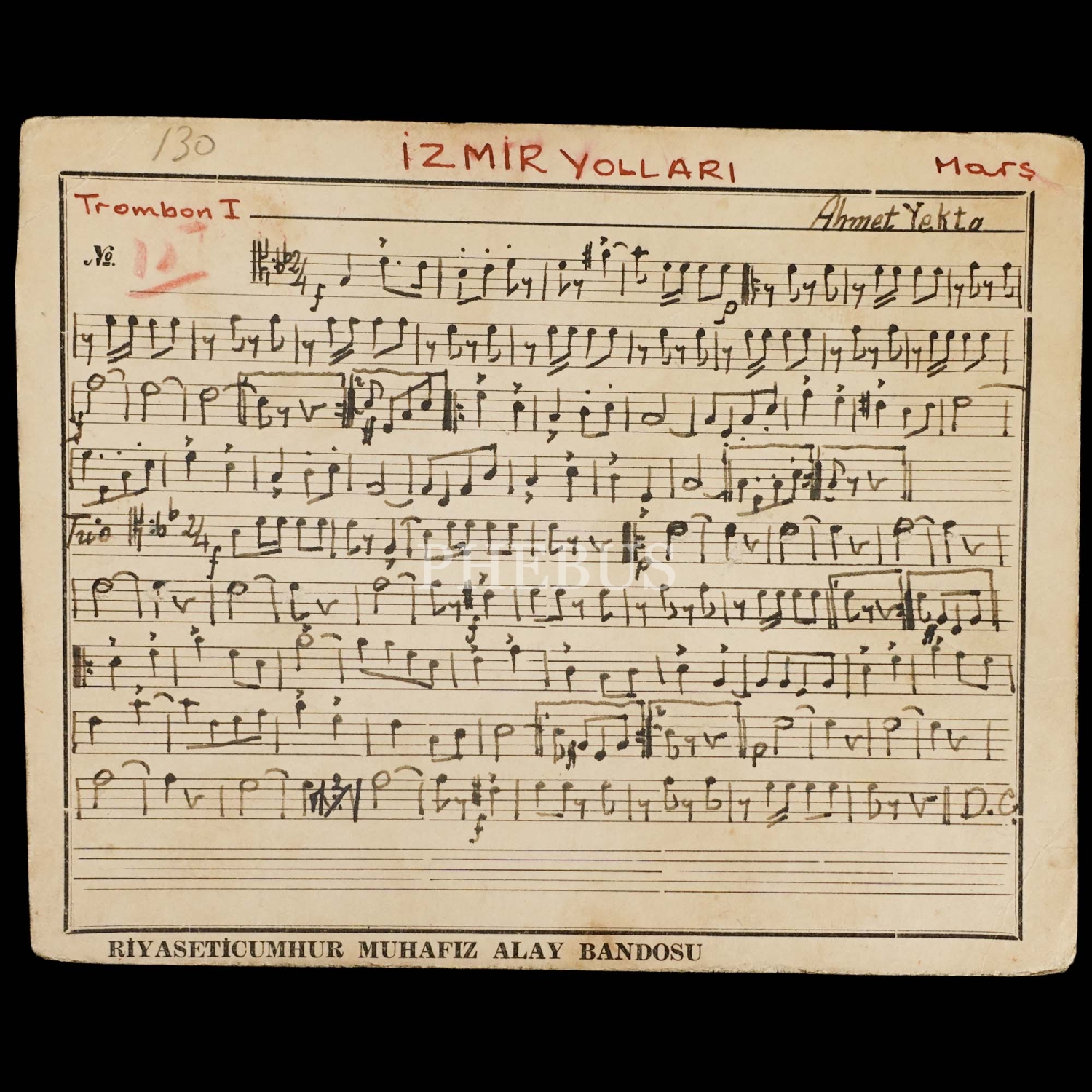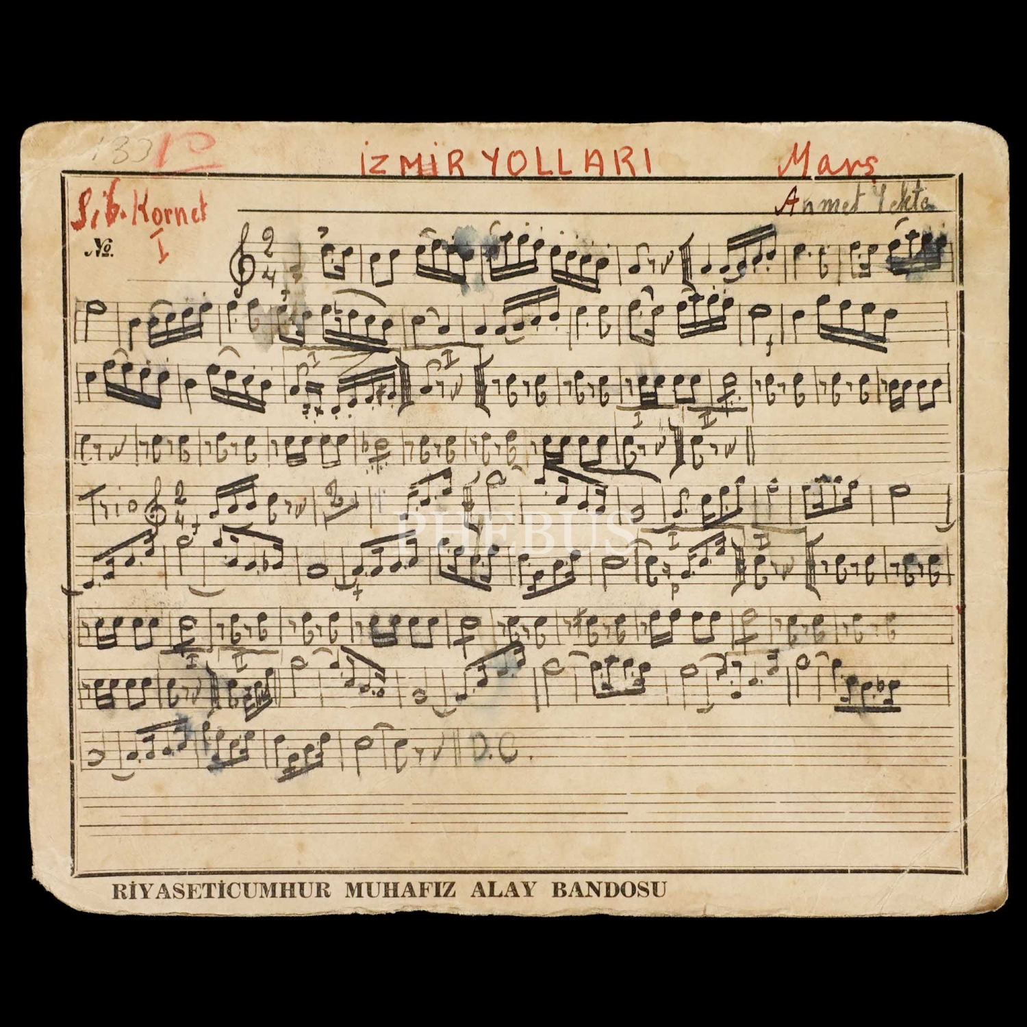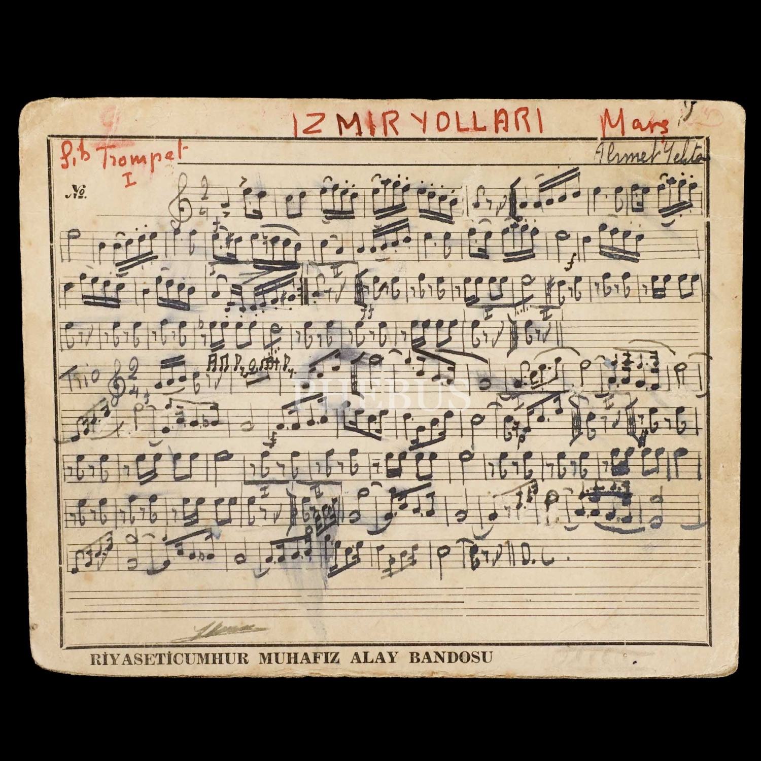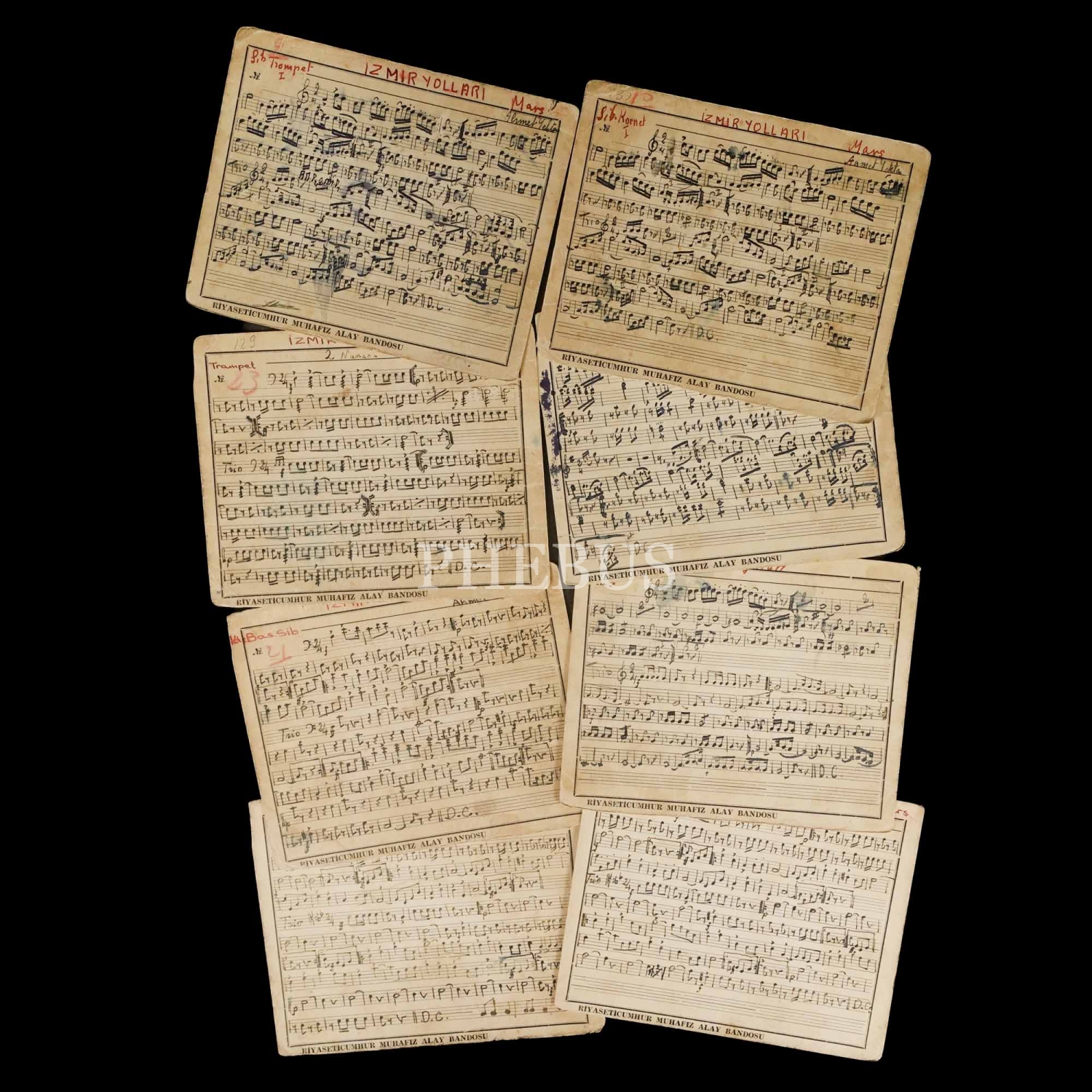 Riyaseticumhur Muhafız Alay Bandosu´nda vazifeli Ahmet Yekta´nın üzerlerine el yazısıyla birtakım notlar aldığı 8 adet "İzmir Yolları" marşı notası, 16x13 cm...