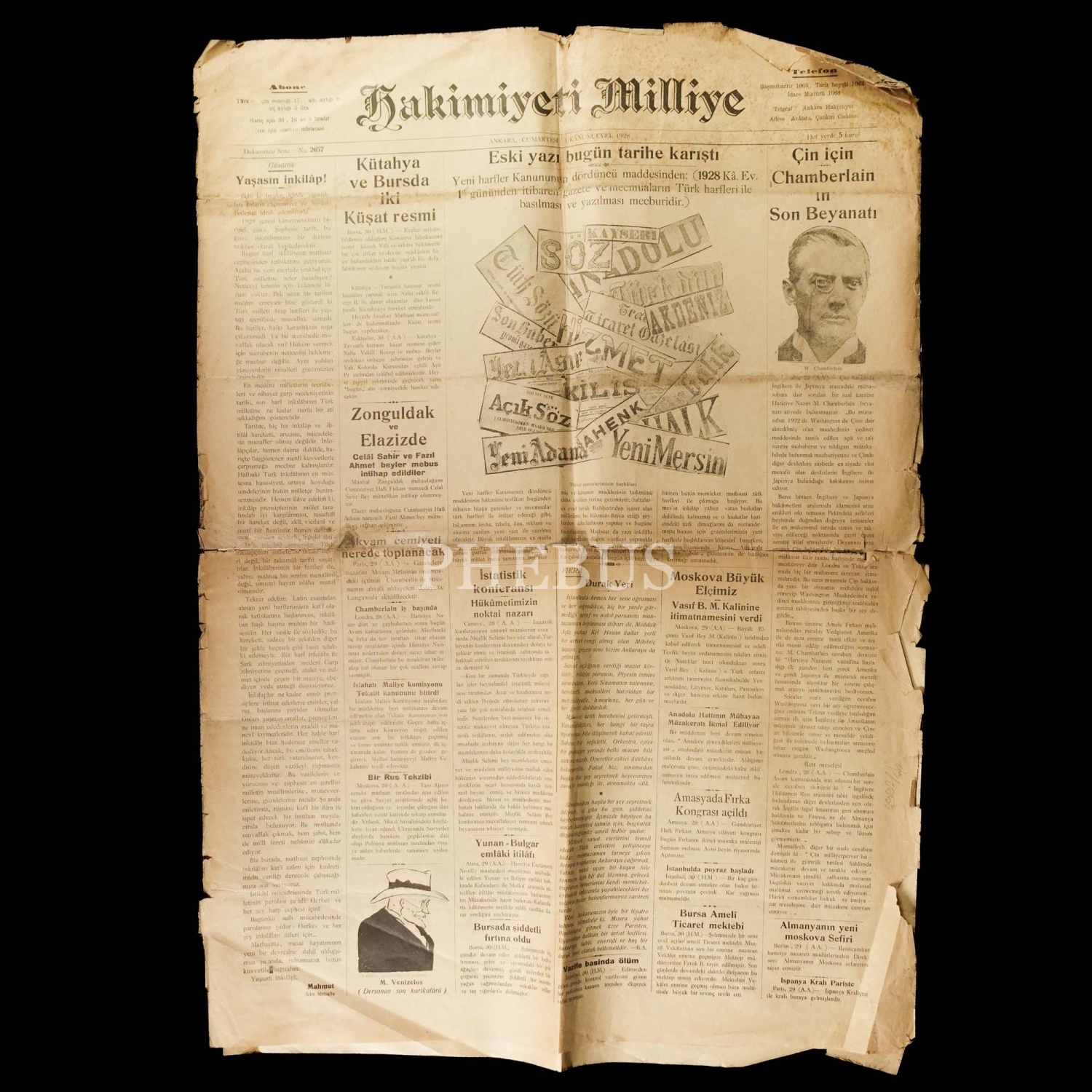 HAKİMİYETİ MİLLİYE gazetesinin, "Eski Yazı Bugün Tarihe Karıştı" manşetli, 1 Kânunuevel 1928 tarihli 2657. sayısı, 6 sayfa, 44x62 cm...