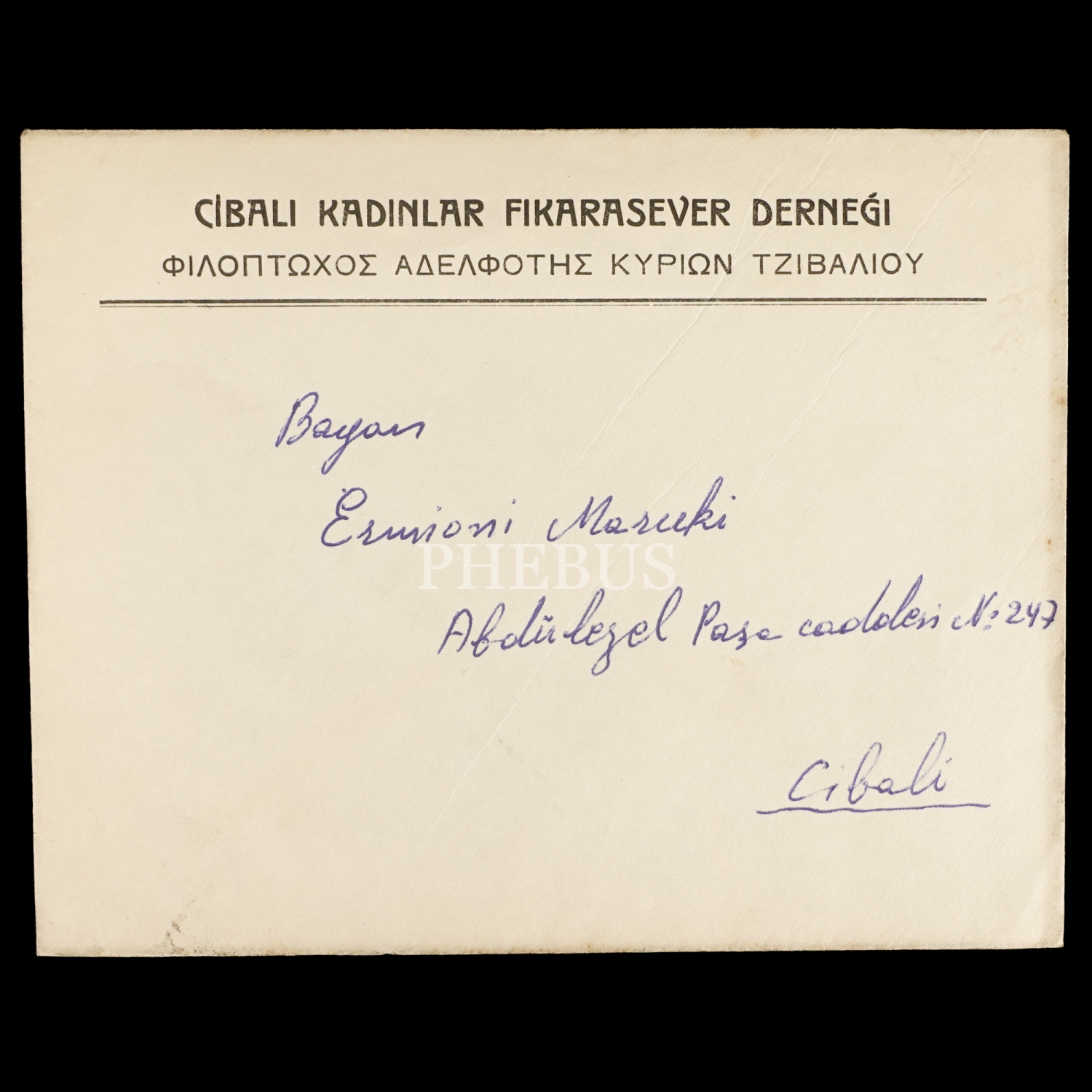 Türkçe - Rumca "Cibali Kadınlar Fıkarasever Derneği" antetli zarf, 16x13 cm...