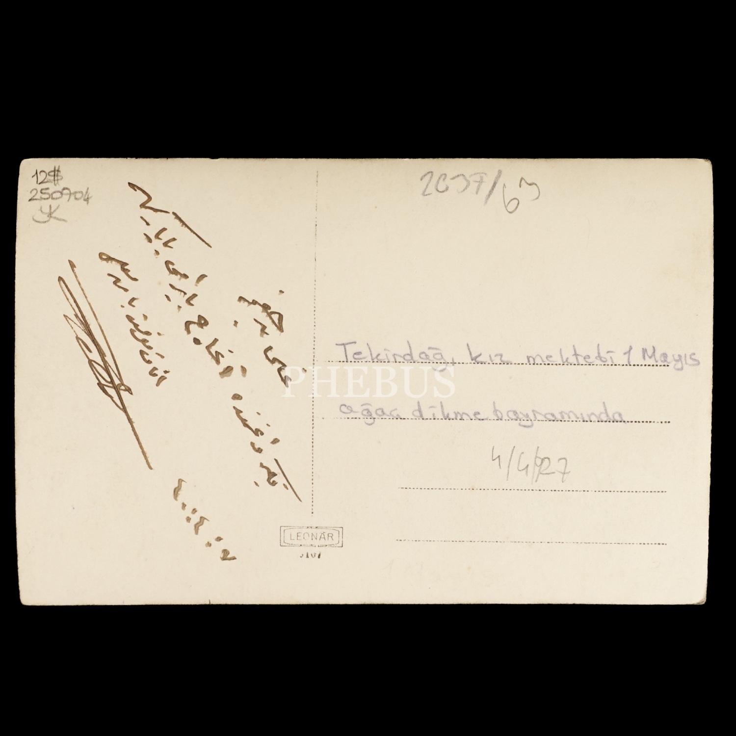 Fotoğrafın arka yüzünde, okulun başöğretmeninin kaleme aldığı "Ali Beyciğime; Tekirdağı´nda Ağaç Bayramı yaparken" ithafı ve imzası yer almaktadır.