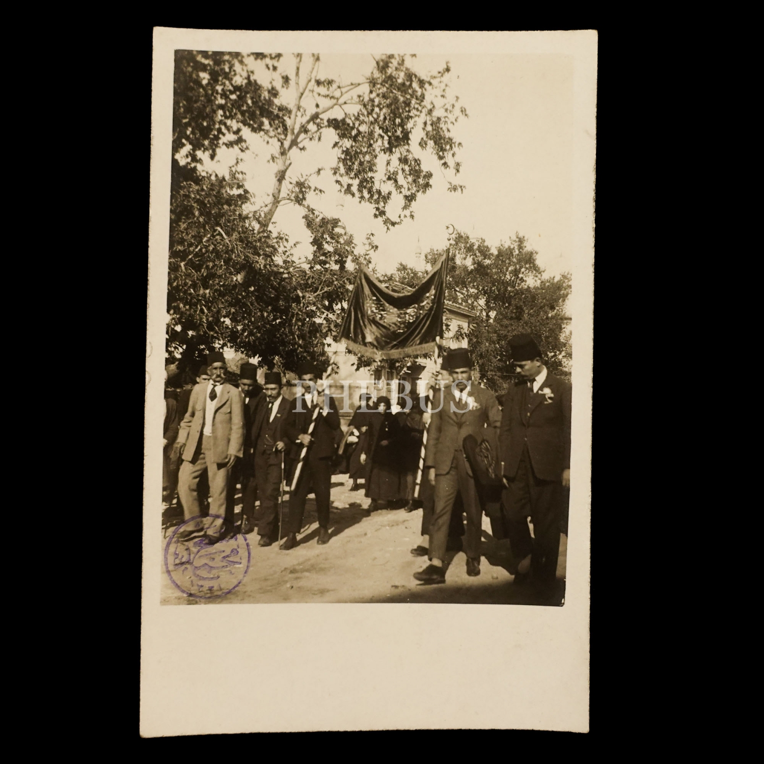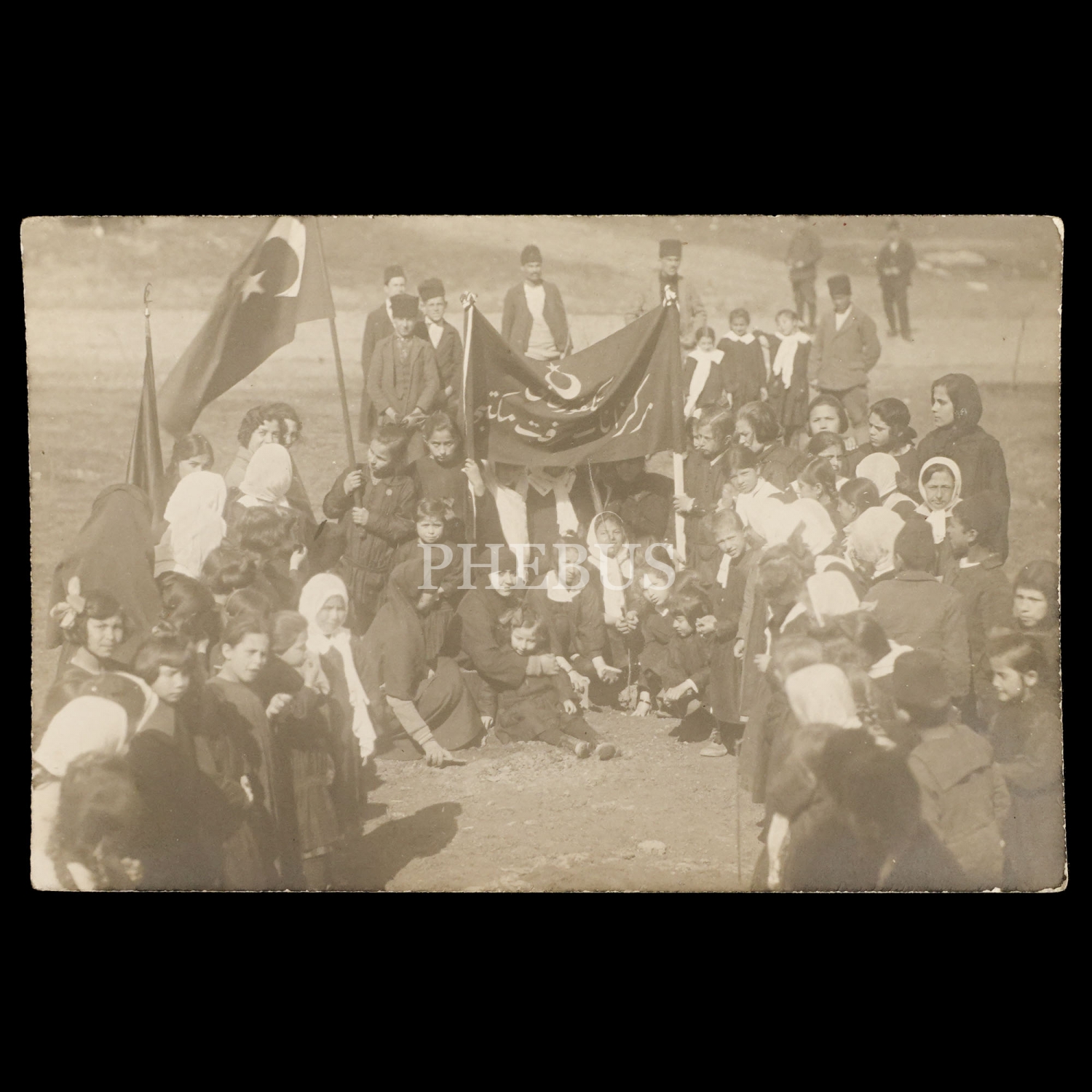 Tekirdağ Kız Mektebi öğrencileri ve öğretmenlerinin, Ağaç Dikme Bayramı´nda "Tekfurdağı Merkez İnas Marifet Mektebi" yazılı bayrak altında çektirdikleri hatıra fotoğrafı, 14x9 cm...
