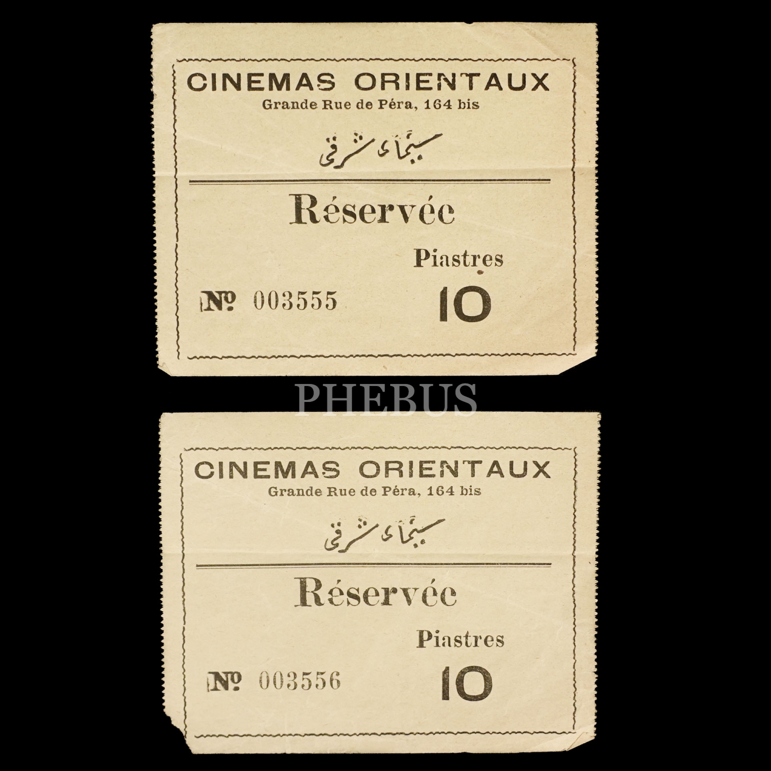 İstanbul´da açılan ikinci sinema olan Cinemas Orientaux´un (sonraki yıllarda Şark ve Lüks) ilk yıllarına ait son derece nadir iki adet sinema bileti, Grande Rue de Pera adresli, 10x8 cm...