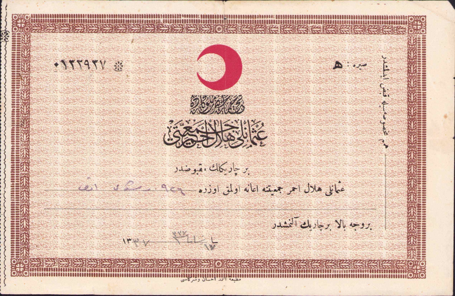 Osmanlıca Hilal-i Ahmer Cemiyeti makbuz, 20x14 cm