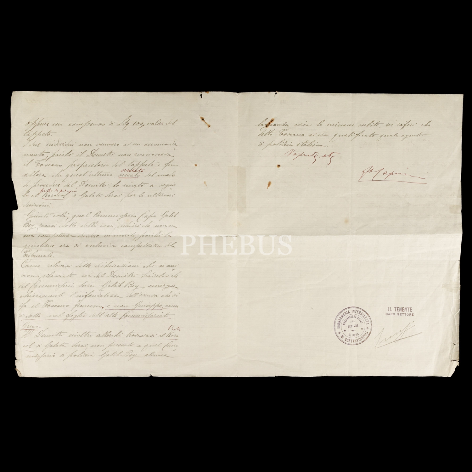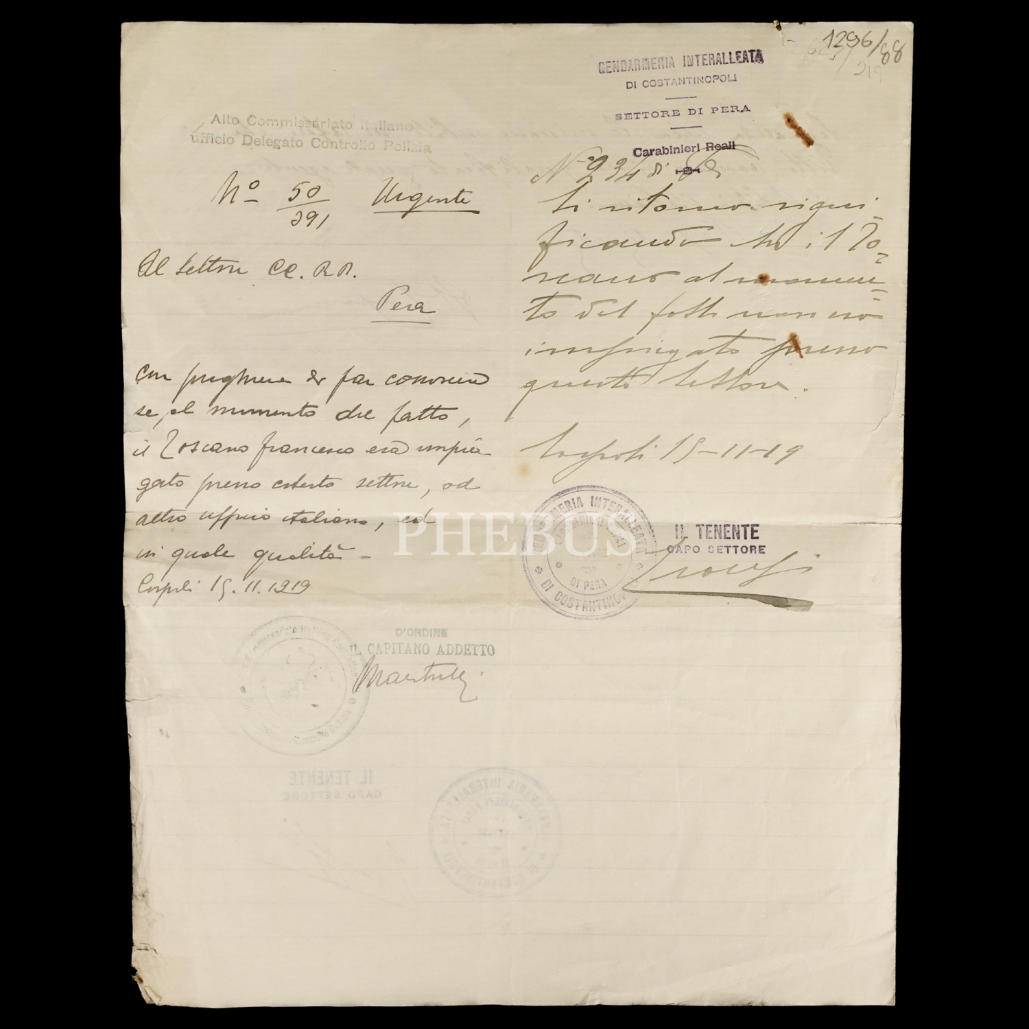 İşgal döneminden, "Konstantinopolis Müttefiklerarası Jandarma Teşkilatı" (Gendarmeria Interalleata di Costantinopoli) antetli, 1919 tarihli İtalyanca izin belgesi, 22x28 cm...