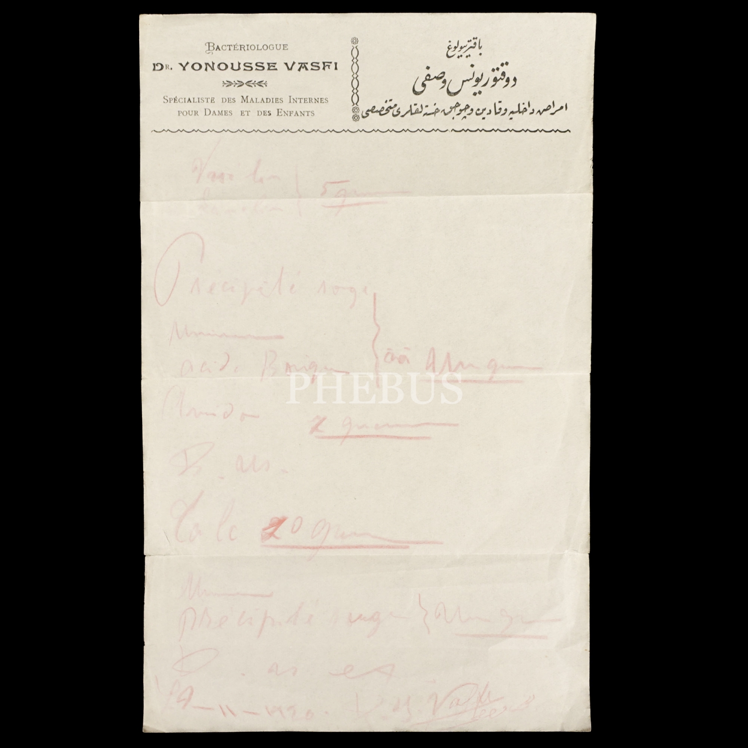 "Emraz-ı dahiliye ve kadın ve çocuk hastalıkları mütehassısı Bakteriyolog Doktor Yunus Vasfi" antetli reçete, 14x22 cm...