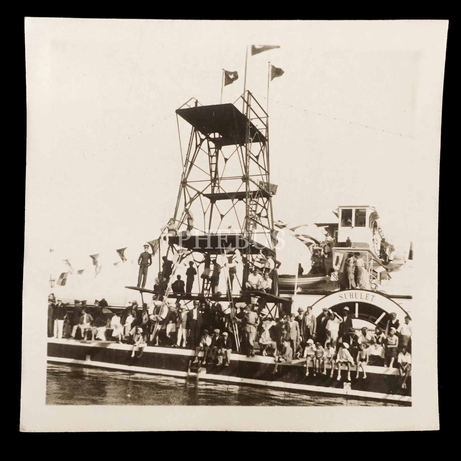 Dünyanın bilinen ilk arabalı vapuru olarak tarihe geçen "Suhulet"te düzenlenen bir yarışma için kurulan atlama kulesi ve seyirciler, 6x6 cm...