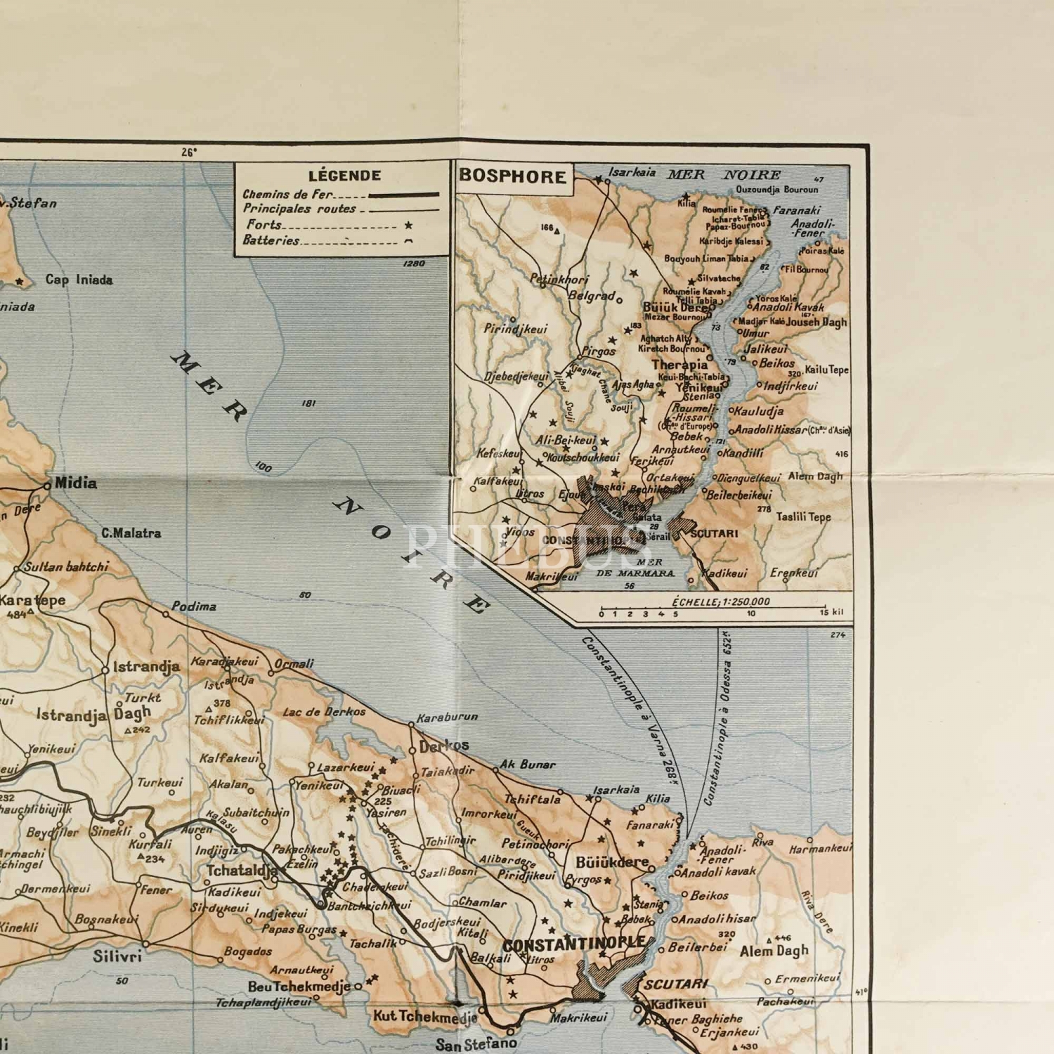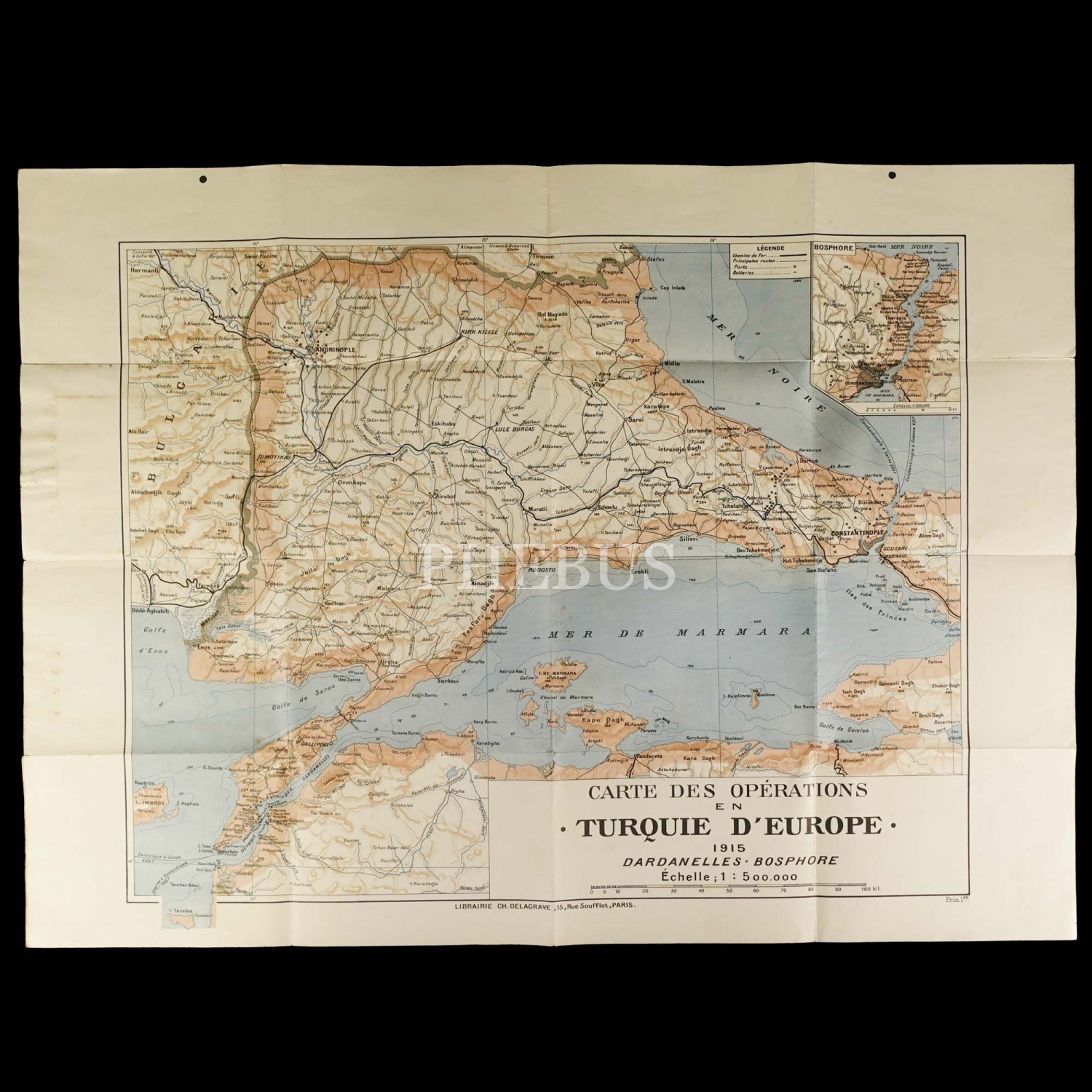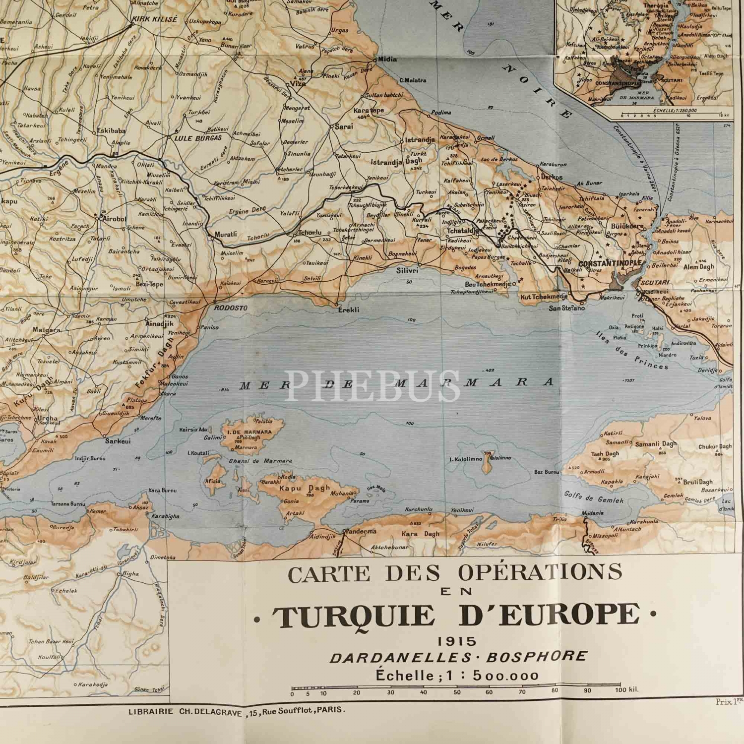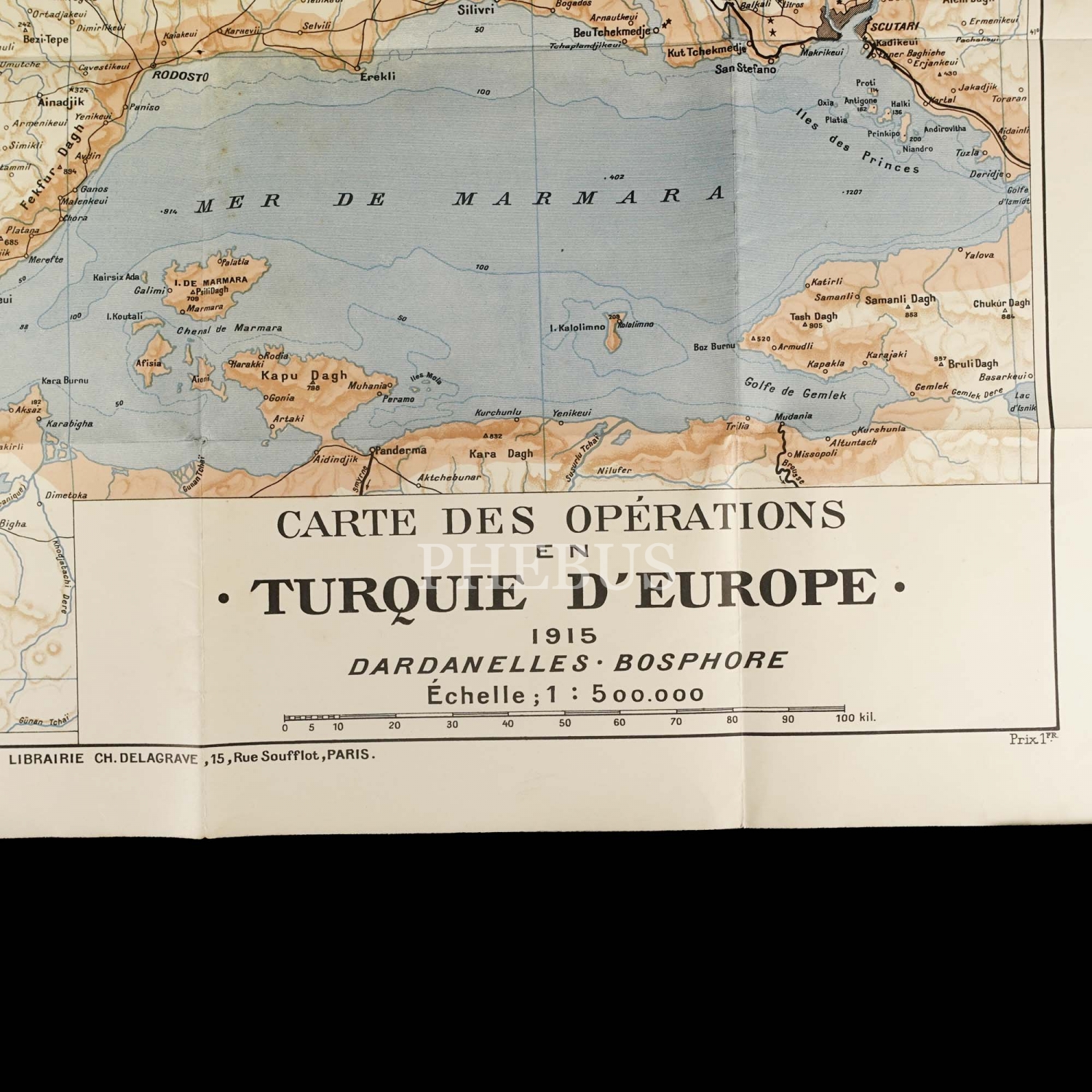 Birinci Dünya Savaşı´nda kilit bir rol oynayan "Avrupa Türkiye´si"nden Çanakkale ve Boğaziçi´nin görüldüğü harita, "Carte des Operations en Turquie d´Europe (1915) Dardanelles - Bosphore", Librairie Ch. Delagrave, Paris, 76x56 cm...