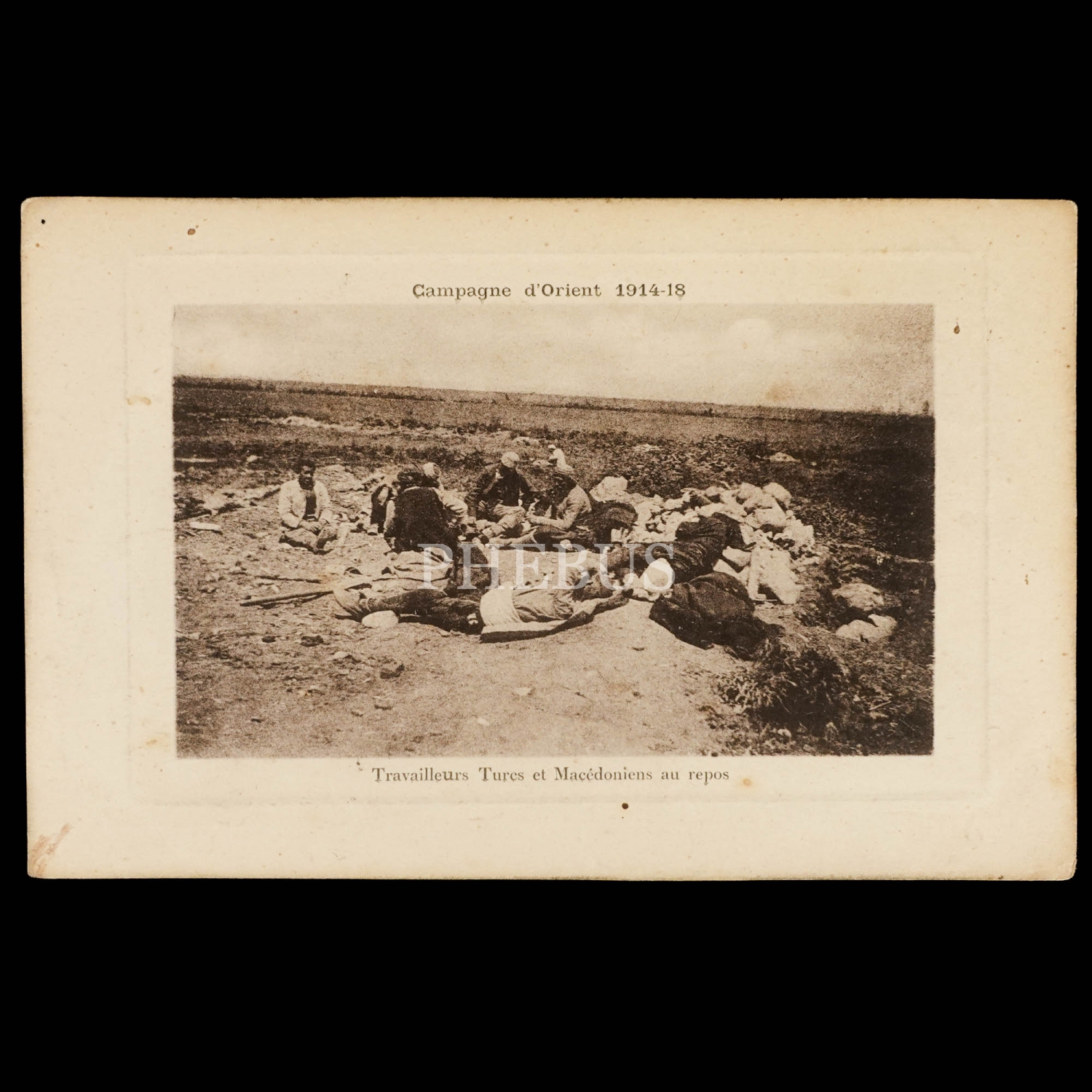 Birinci Dünya Savaşı´nda görev alan Türk ve Makedon işçileri molada gösteren gofre çerçeveli kartpostal, "Campagne d´Orient 1914-18 - Travailleurs Turcs et Macedoniens au repos", 14x9 cm...