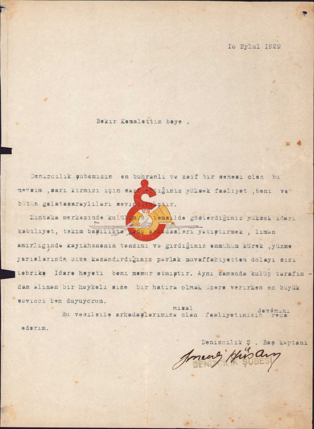 Galatasaray Denizcilik Şubesi Kaptanı imzalı 1929 tarihli döküman