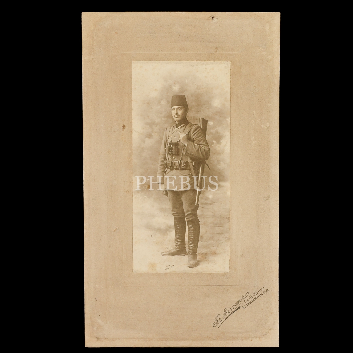 Tam teçhizatlı bir Osmanlı subayının Th. Servanis Fotoğrafhanesi´nde (Cadi-Keuy [Kadıköy], Constantinople) aldırdığı hatıra fotoğrafı, fotoğraf 7x15 cm, paspartu 14x24 cm...