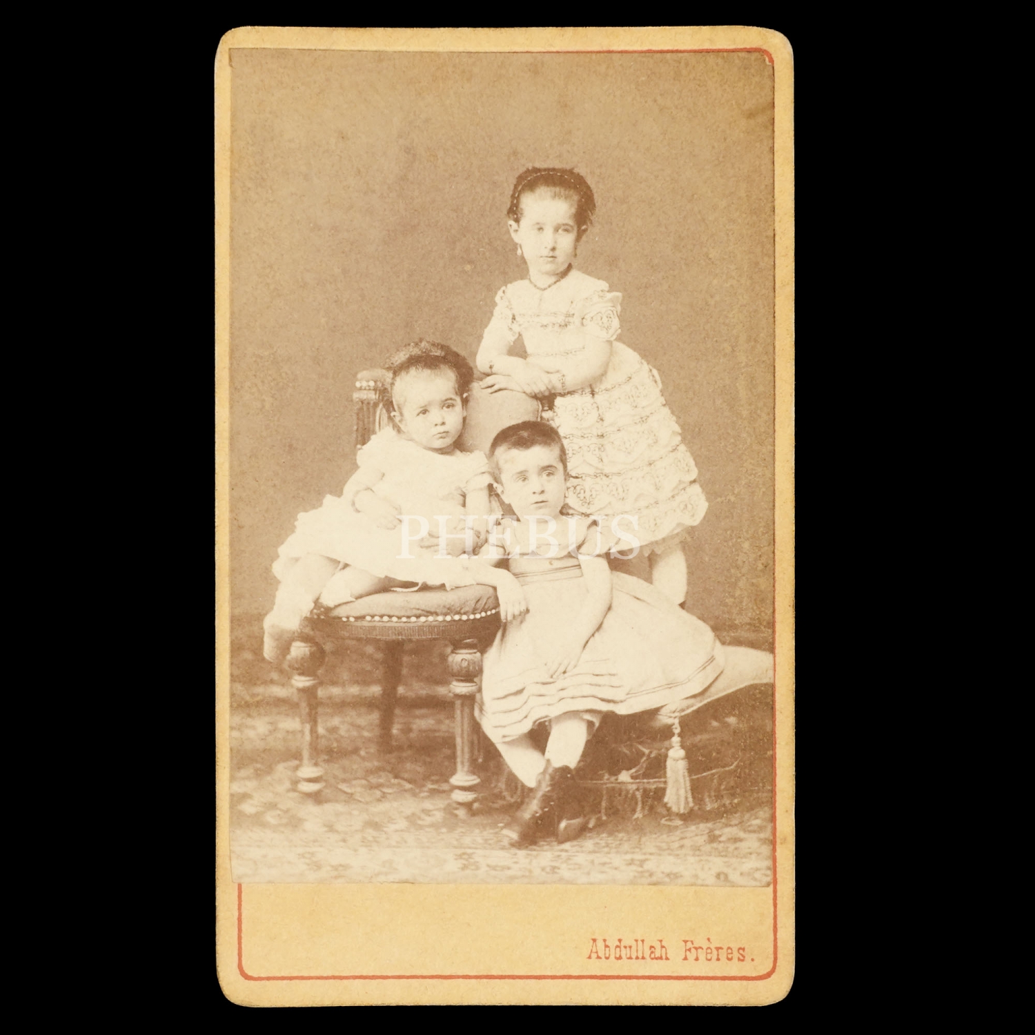 Üç küçük kardeşin Abdullah Freres Fotoğrafhanesi´nde (Constantinople) aldırdıkları CDV (kartvizit) boy hatıra fotoğrafı, 6x11 cm...