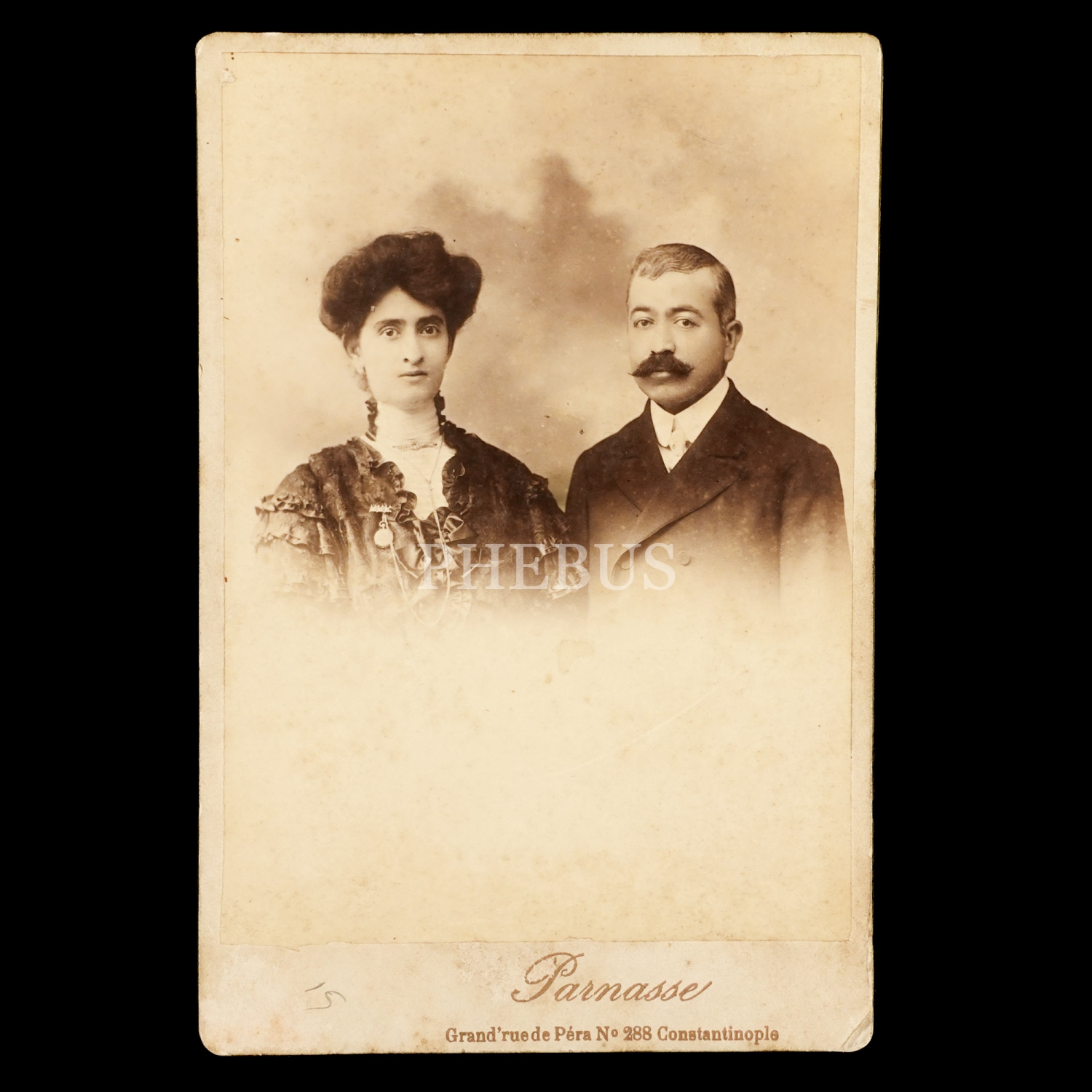 Levanten bir çiftin Parnasse Fotoğrafhanesi´nde (Grand Rue de Pera, Constantinople) aldırdıkları kabin fotoğraf, 11x17 cm...