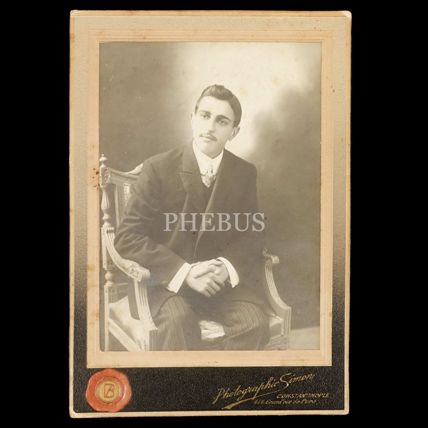 Şık giyimli bir beyefendinin Simon Fotoğrafhanesi´nde (Grand Rue de Pera, Constantinople) aldırdığı kabin fotoğraf, 13x18 cm...