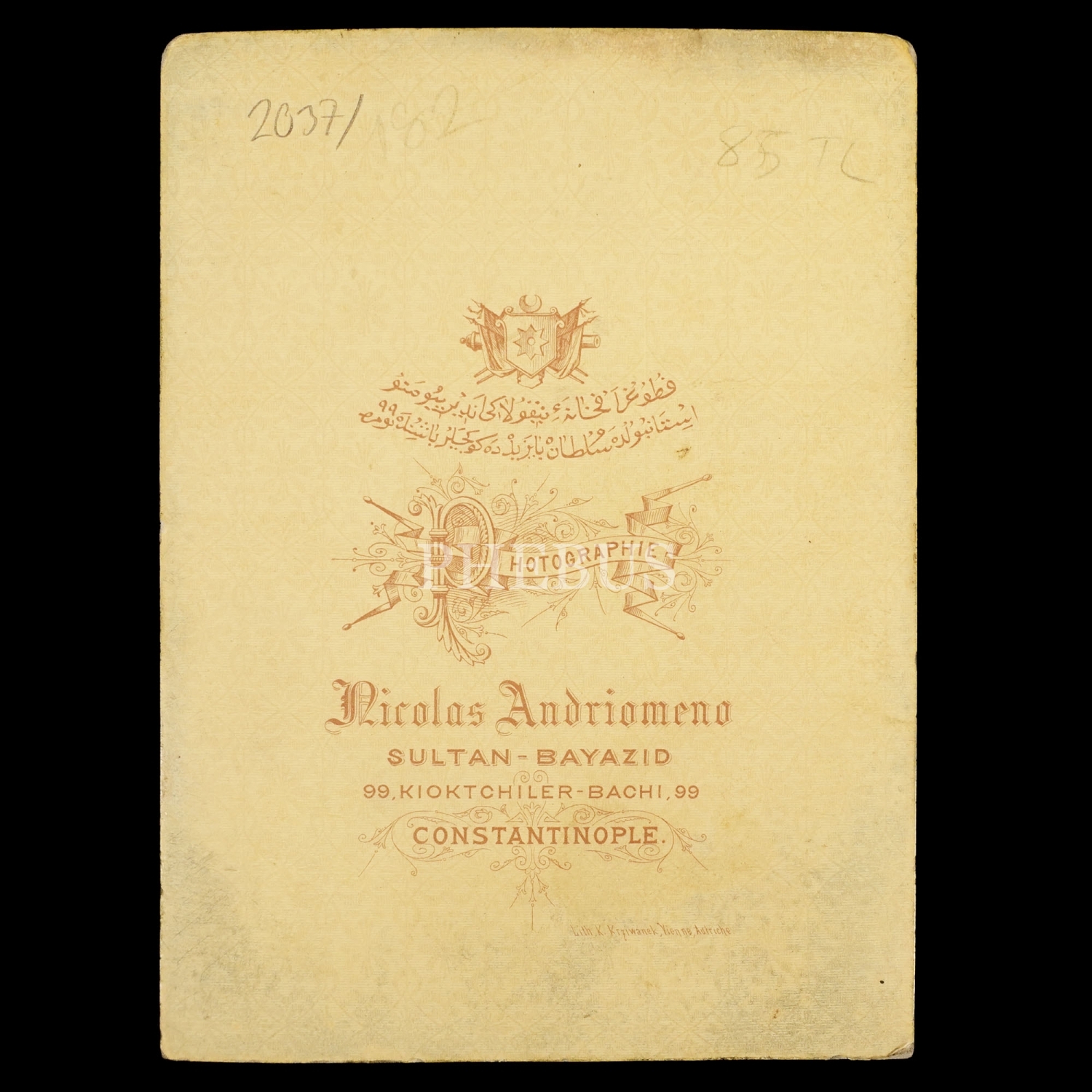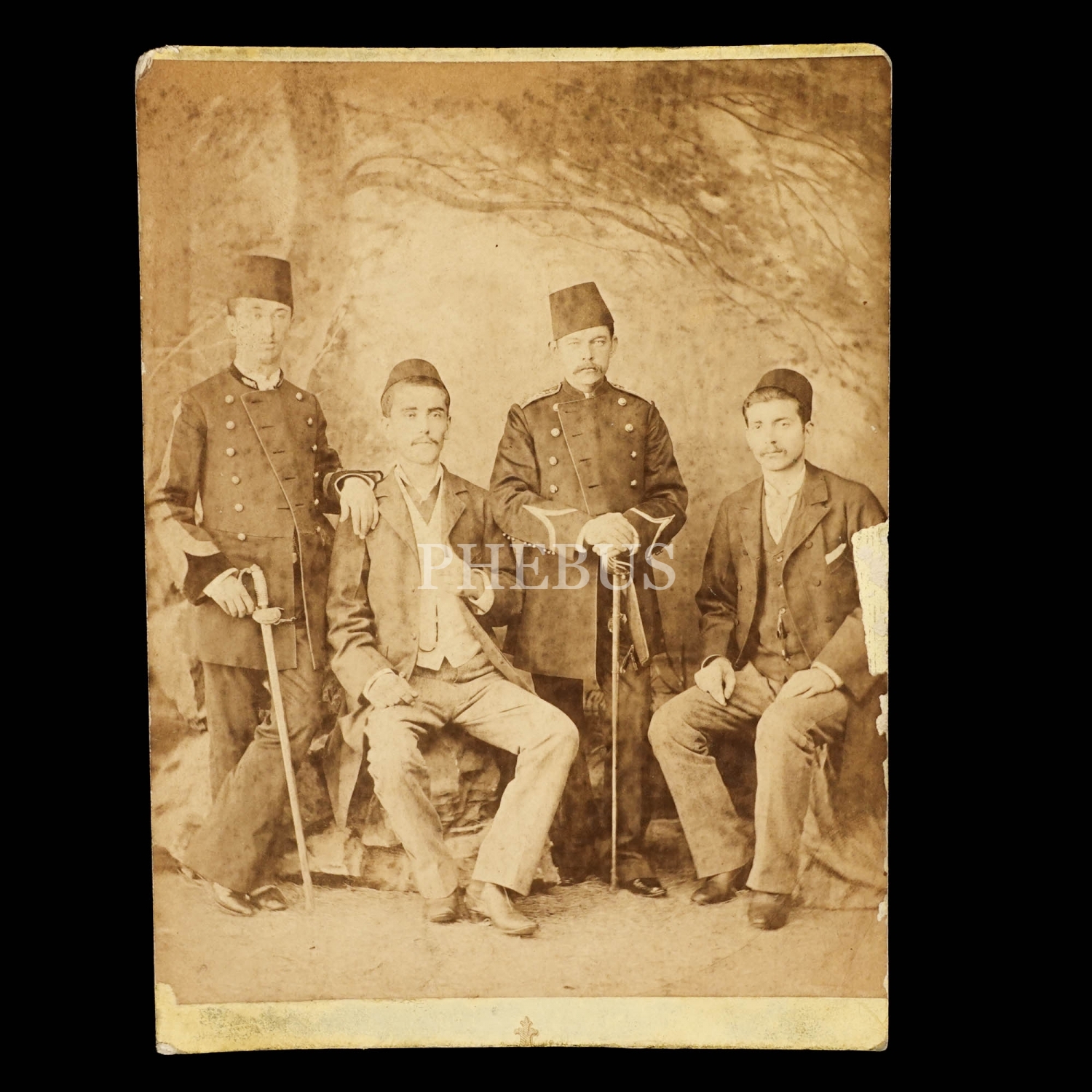 İki Osmanlı subayı ile sivil arkadaşlarının Nicolas Andriomenos Fotoğrafhanesi´nde (Sultan-Bayazid, Constantinople) aldırdıkları kabin fotoğraf, 11x15 cm...
