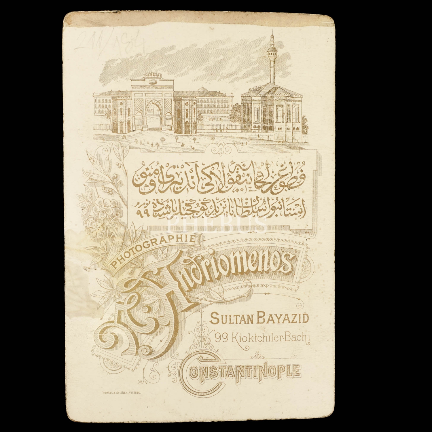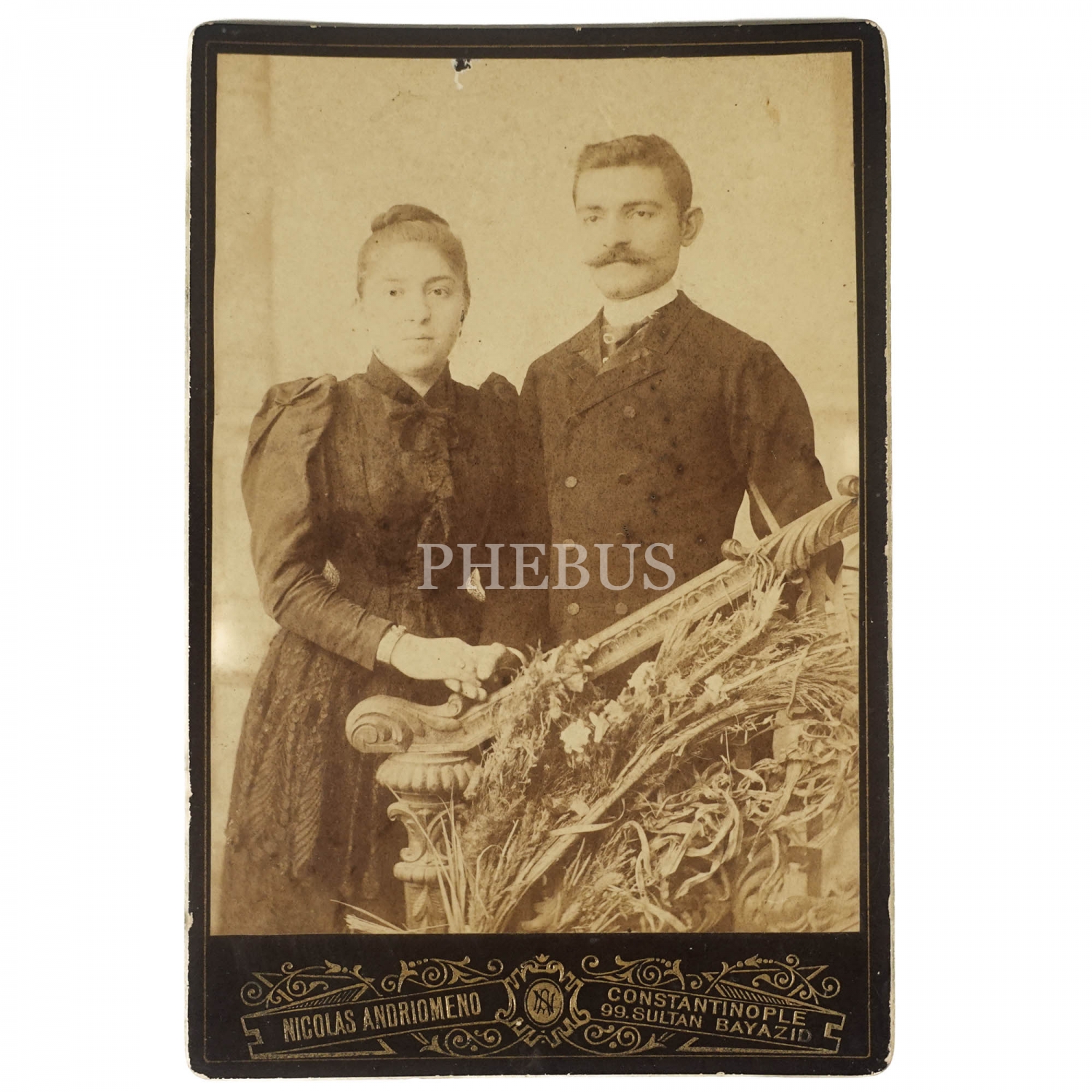 Levanten bir çiftin Nicolas Andriomenos Fotoğrafhanesi´nde (Sultan-Bayazid, Constantinople) aldırdıkları kabin fotoğraf, 11x16 cm...