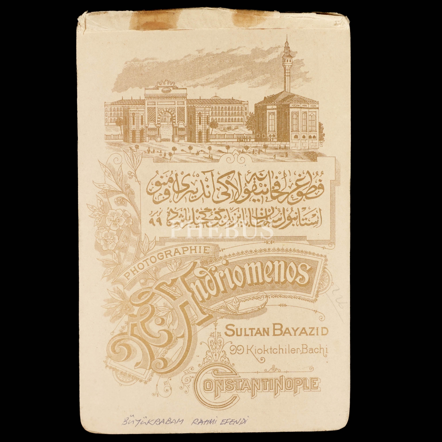 Fotoğrafın arka yüzüne yeni harflerle "Büyükbabam Rahmi Efendi" notu düşülmüştür. *Koruma kâğıdı karttan ayrık vaziyettedir.