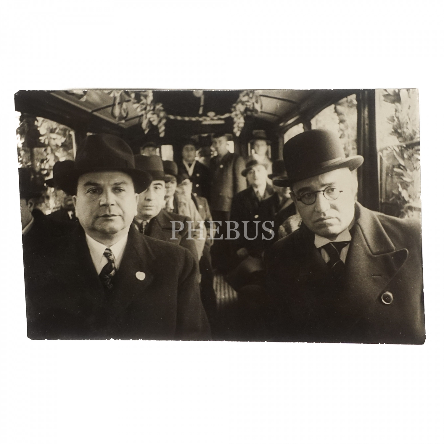 Erken Cumhuriyet döneminde, süslenmiş bir tramvayda seyahat eden beyefendiler, 1 Mart 1939, 14x9 cm...