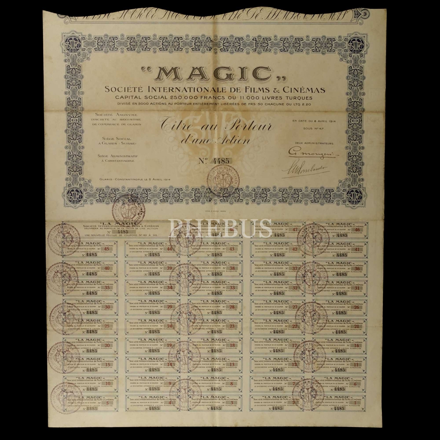 İstanbul´da doğrudan sinema binası olarak kullanılmak üzere tasarlanmış ilk yapıyı inşa eden ve işleten şirketin 8 Nisan 1914 tertibi hisse senedidir. Tarihi yapı, geçmişte "Majik Sineması", "Magic Cinema", "Cine Magique" adlarıyla, günümüzde "Taksim Sahnesi" adıyla anılmaktadır. Hisse senedi üzerinde, tarihi binanın mimarı Giulio Mongeri´nin "Meclis-i İdare Heyeti azası" sıfatıyla imzası yer almaktadır.