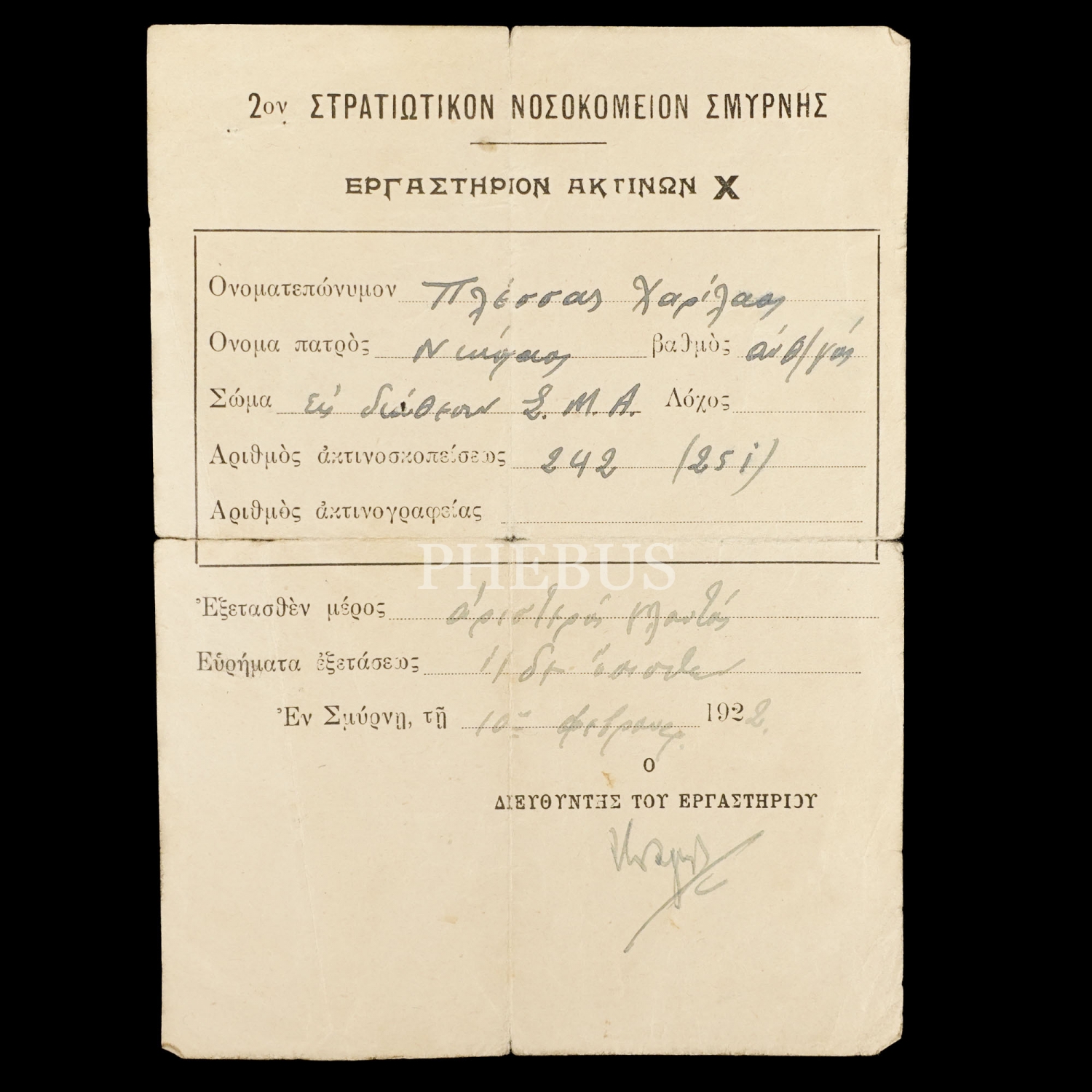 İşgal İzmir´inde faaliyet gösteren askeri hastanenin röntgen laboratuvarı tarafından verilmiş Rumca muayene raporu, 1922, 12x17 cm...
