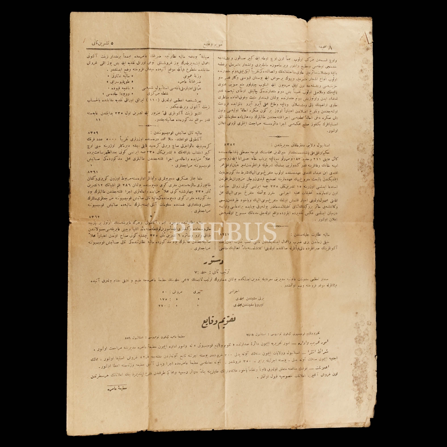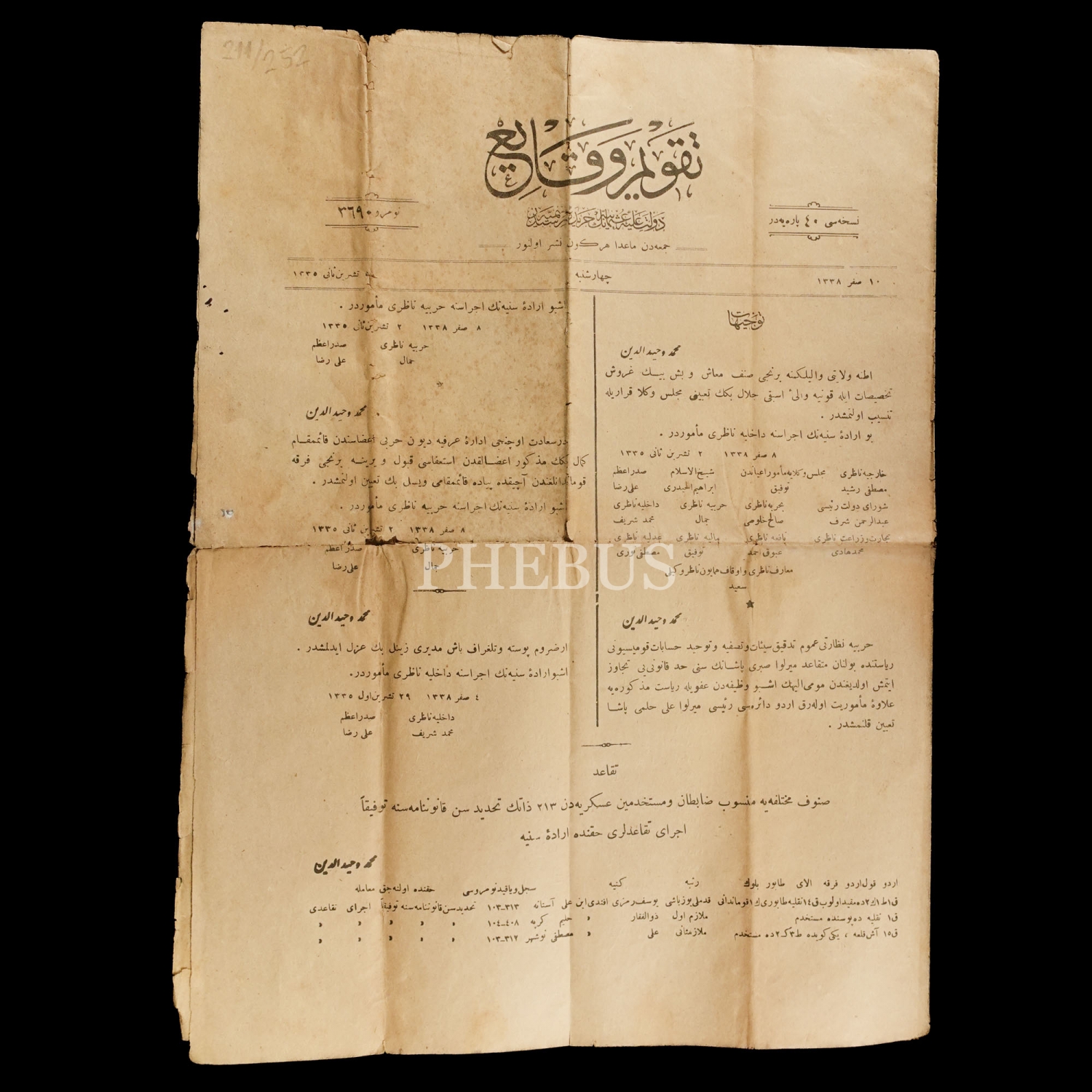 Osmanlı Devleti´nin ilk resmi gazetesi TAKVİM-İ VEKAYİ´nin 10 Safer 1335 tarihli nüshası, 4 sayfa, 25x34 cm...