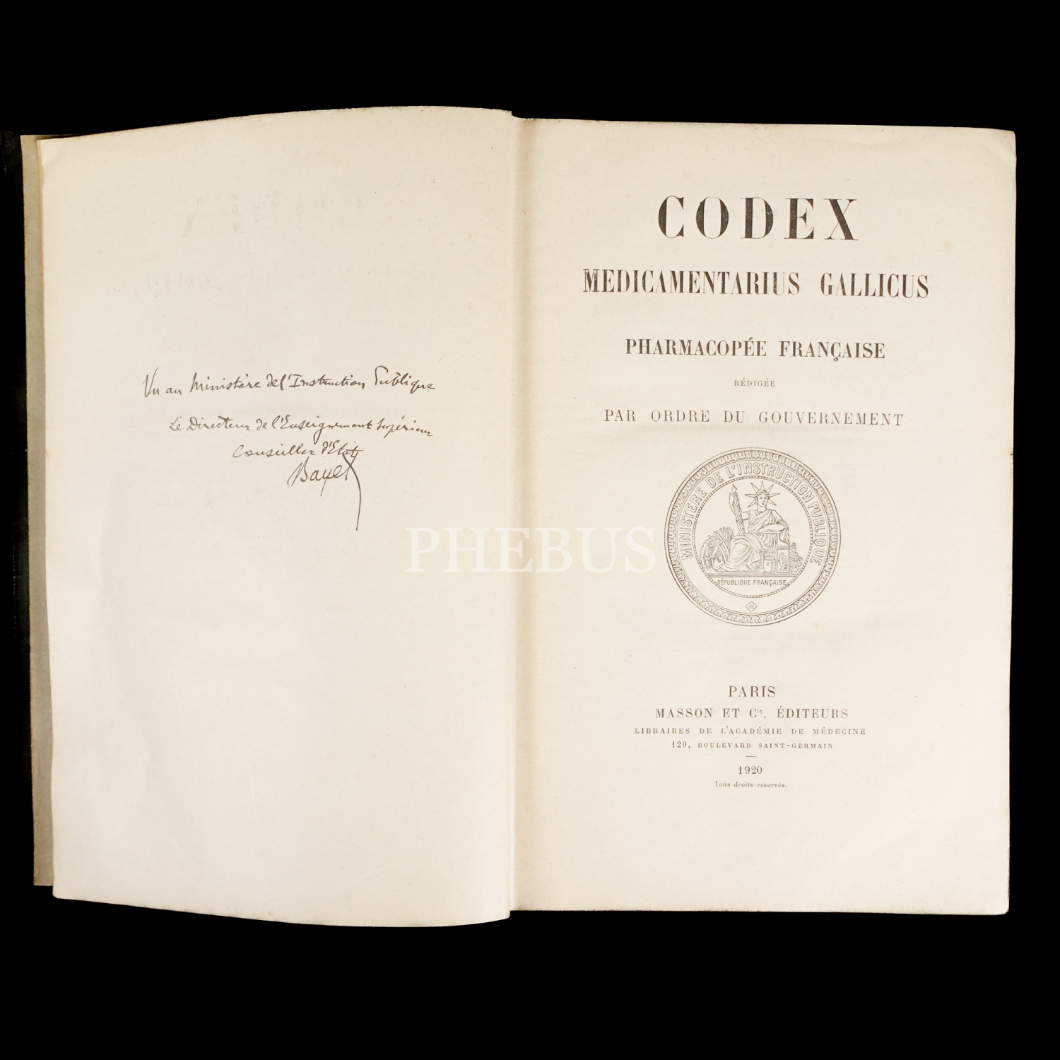 CODEX MEDICAMENTARIUS GALLICUS - PHARMACOPEE FRANÇAISE, Ordre du Gouvernement, 1920, Masson et Cie, Editeurs, Paris, 999+91 sayfa, 17x25 cm...