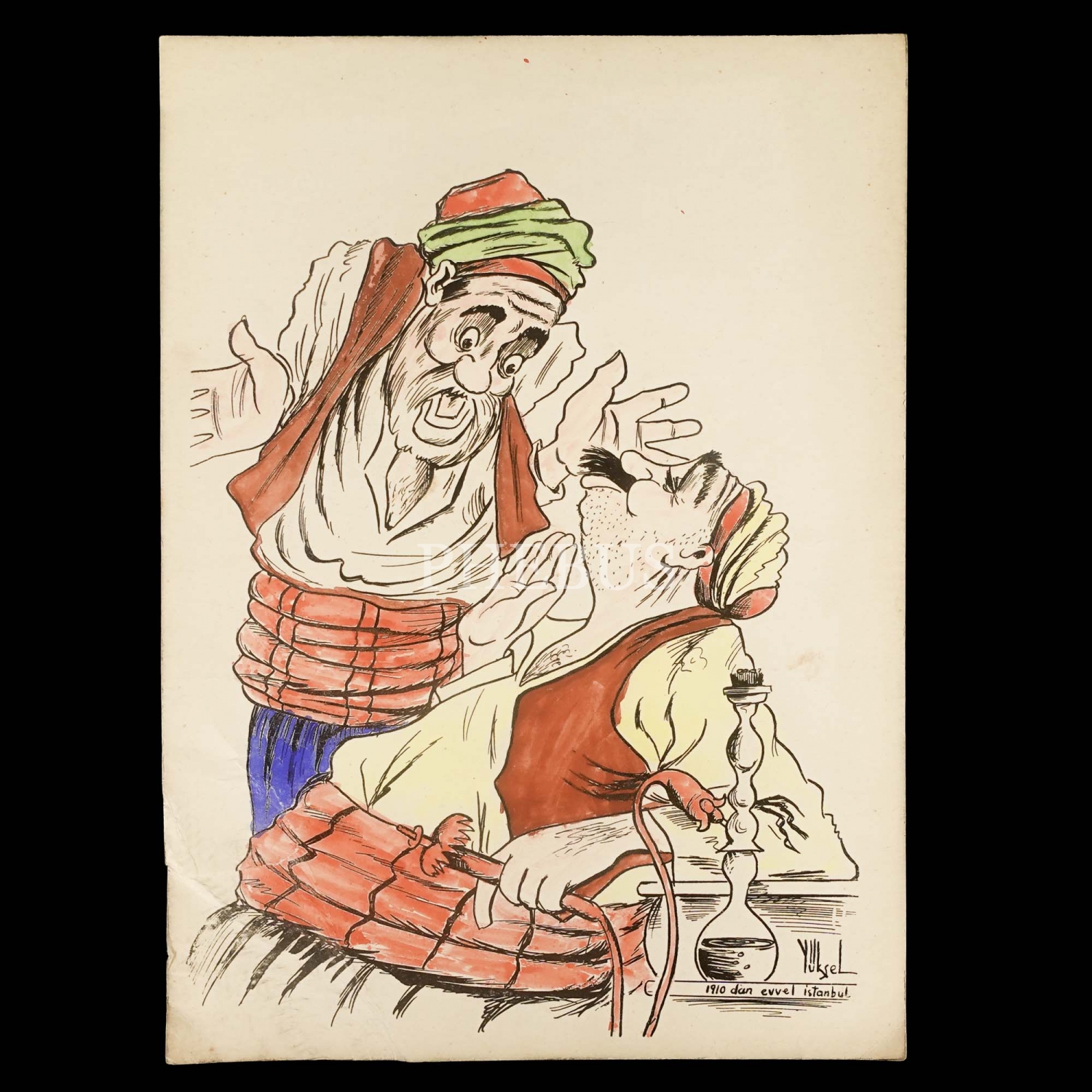 "1910´dan evvel İstanbul" konulu, Yüksel (Ertan) ıslak imzalı karikatür, 22x30 cm...