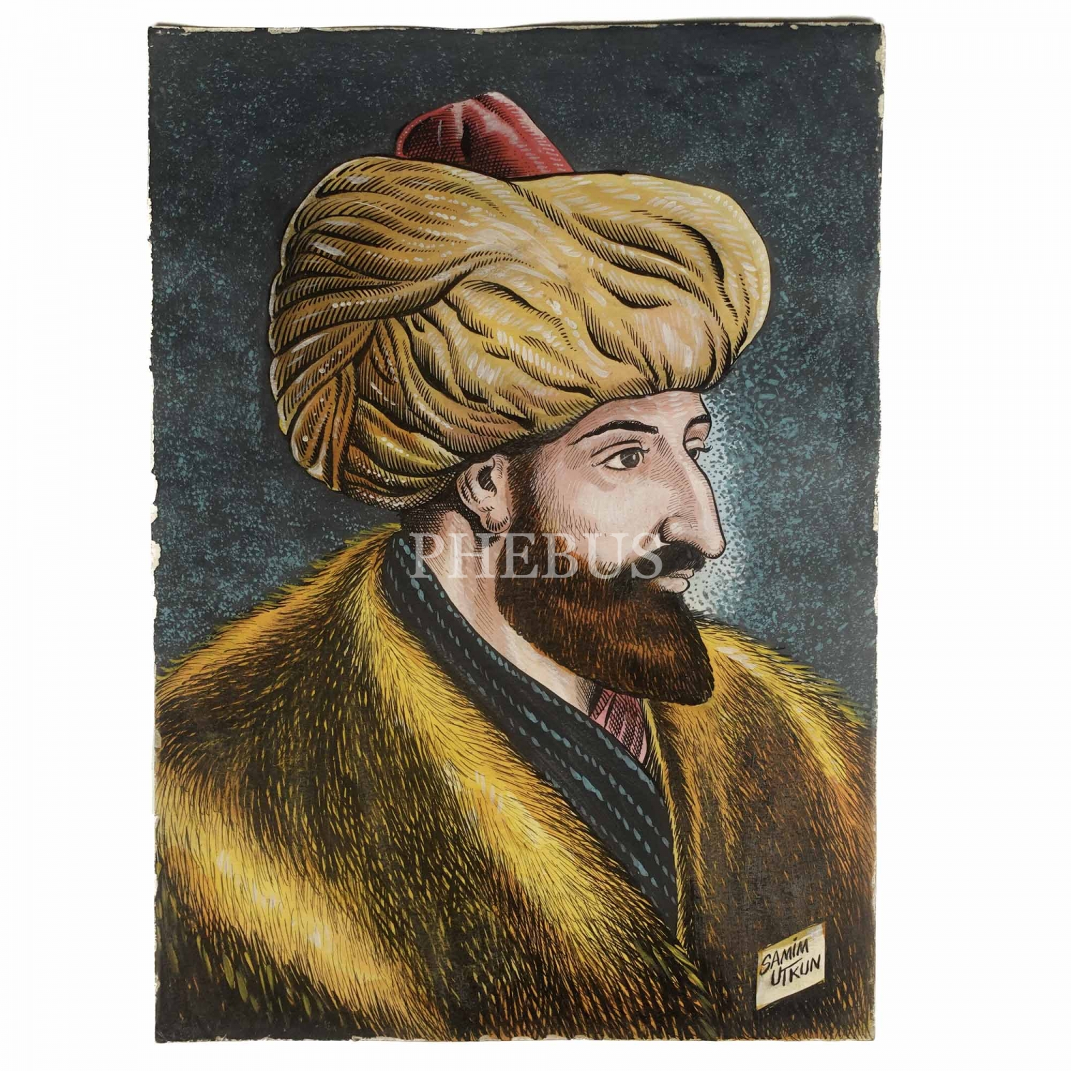Samim Utkun´dan ıslak imzalı Fatih Sultan Mehmed portresi, kâğıt üzeri karışık teknik, 25x35 cm...