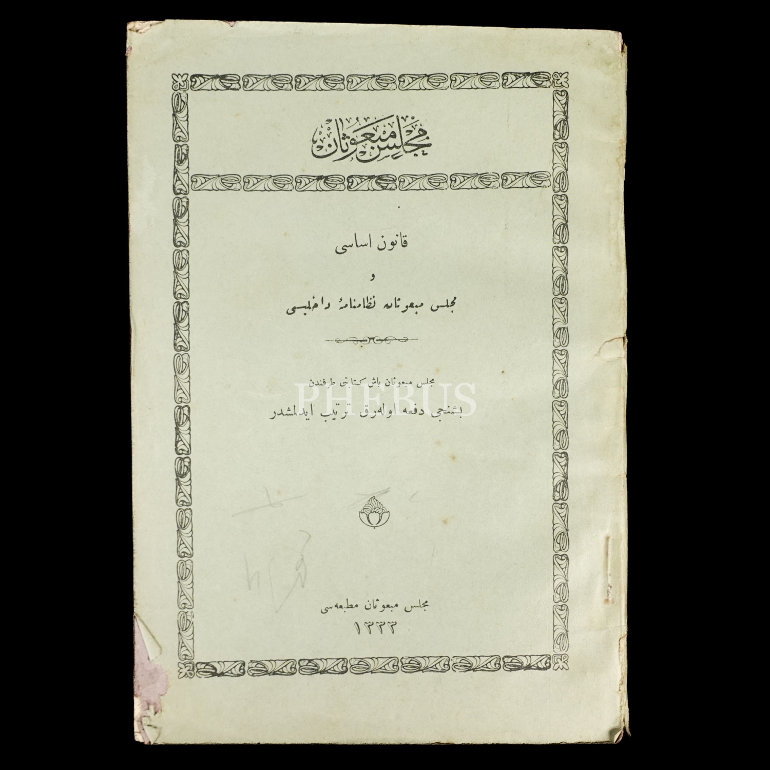 KANUN-İ ESASİ VE MECLİS-İ MEBUSAN NİZAMNAME-İ DAHİLİSİ, Meclis-i Mebusan Başkatibi, 1333, Meclis-i Mebusan Matbaası, 95 sayfa, 13x19 cm...