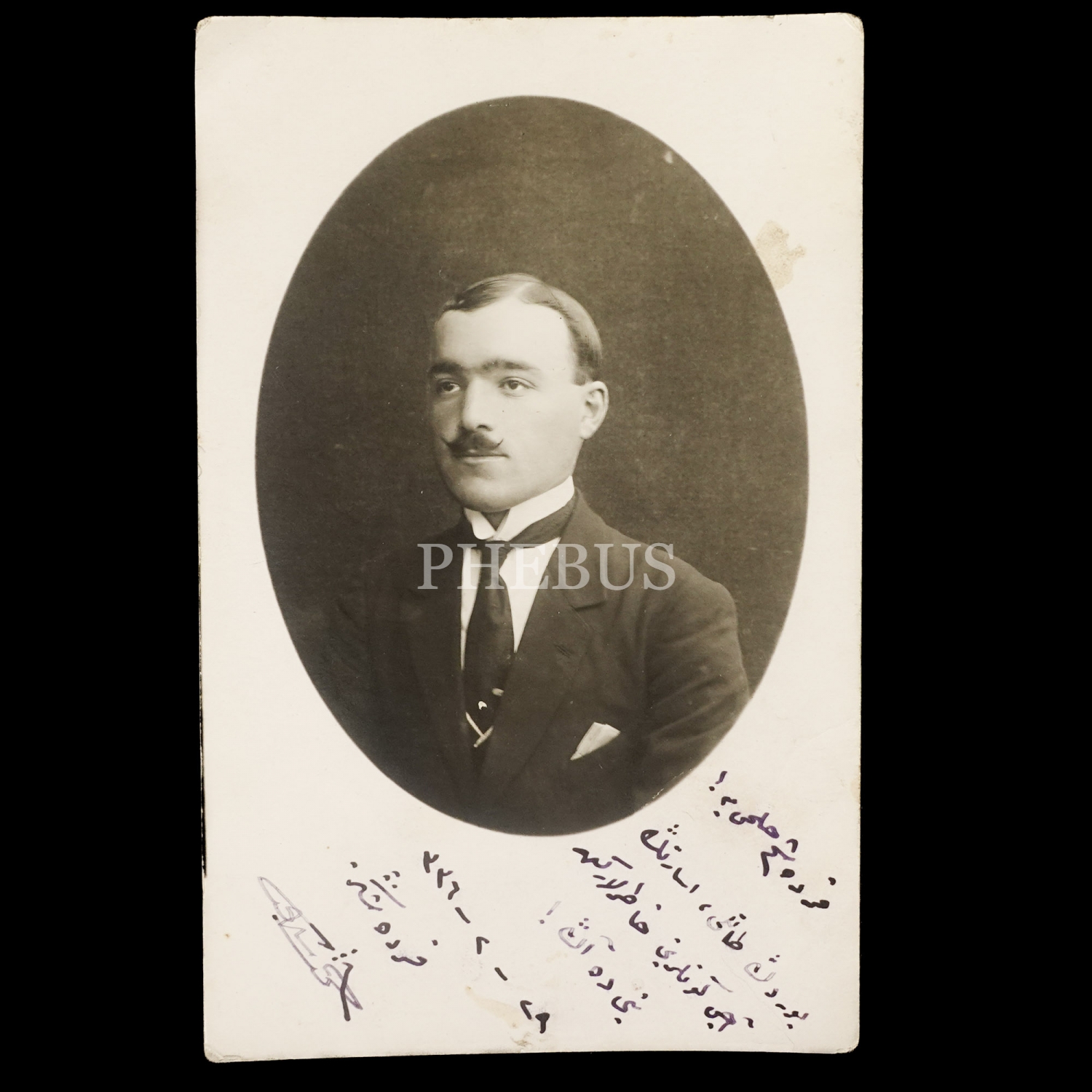 Şık giyimli bir beyefendinin ithaflı ve imzalı fotoğrafı, 14x9 cm...