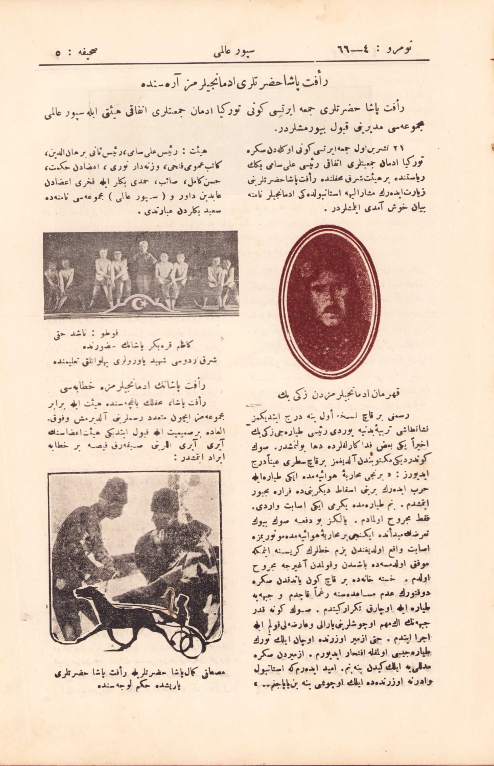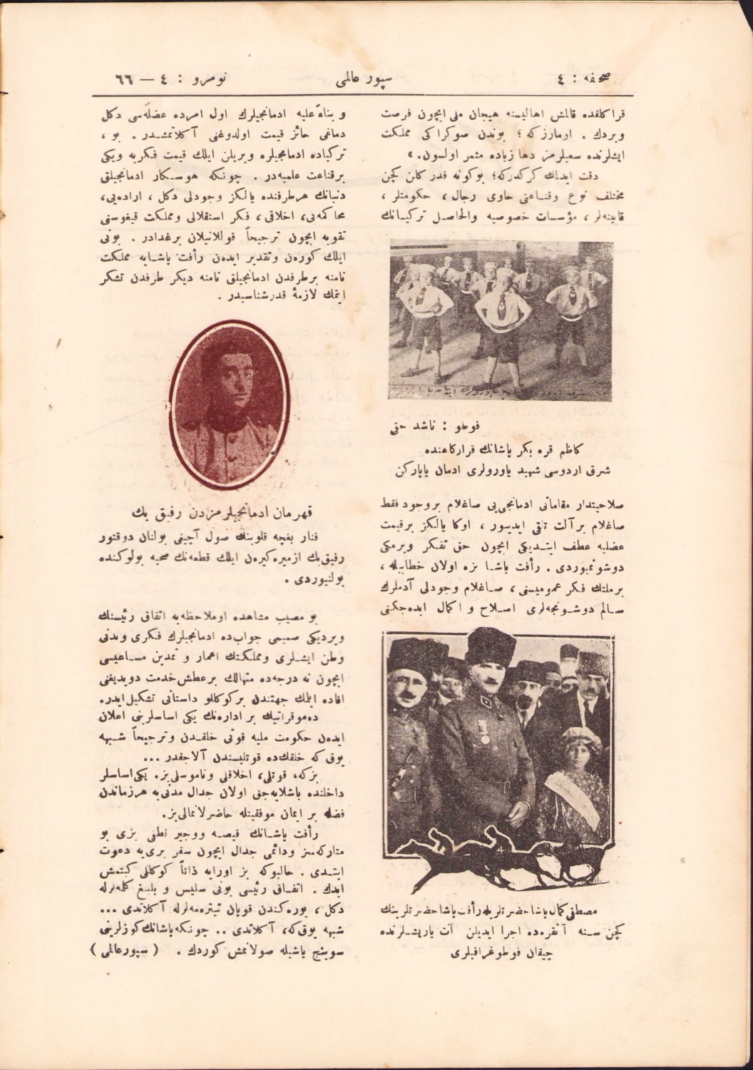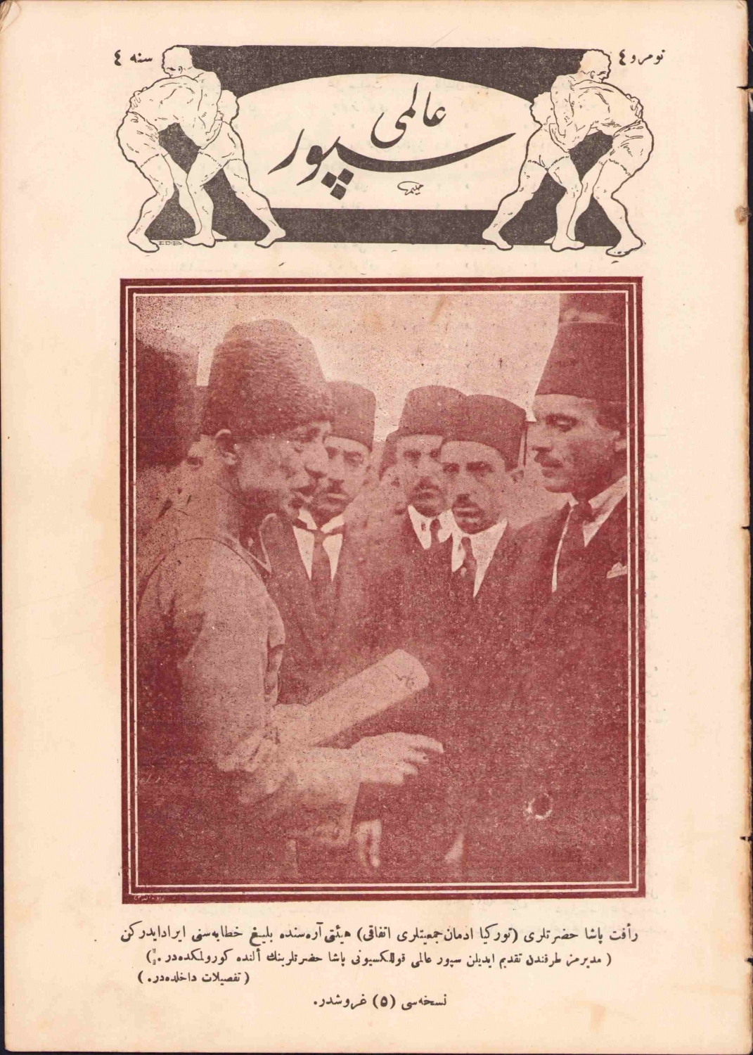 Osmanlıca Spor Alemi mecmuası, kapak "Refet Paşa Hazretleri Türkiye İdman Yurdu İttifakı heyeti arasında beliğ hitabesini irad ederken", 1338, cilt çıkması, 15 sayfa, 20x28 cm
