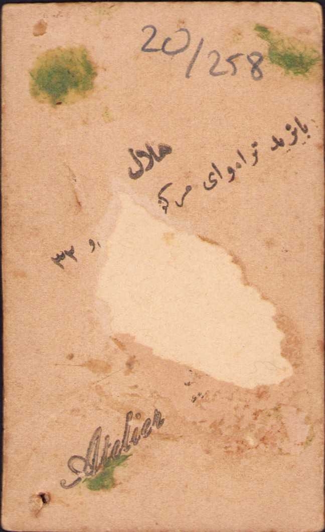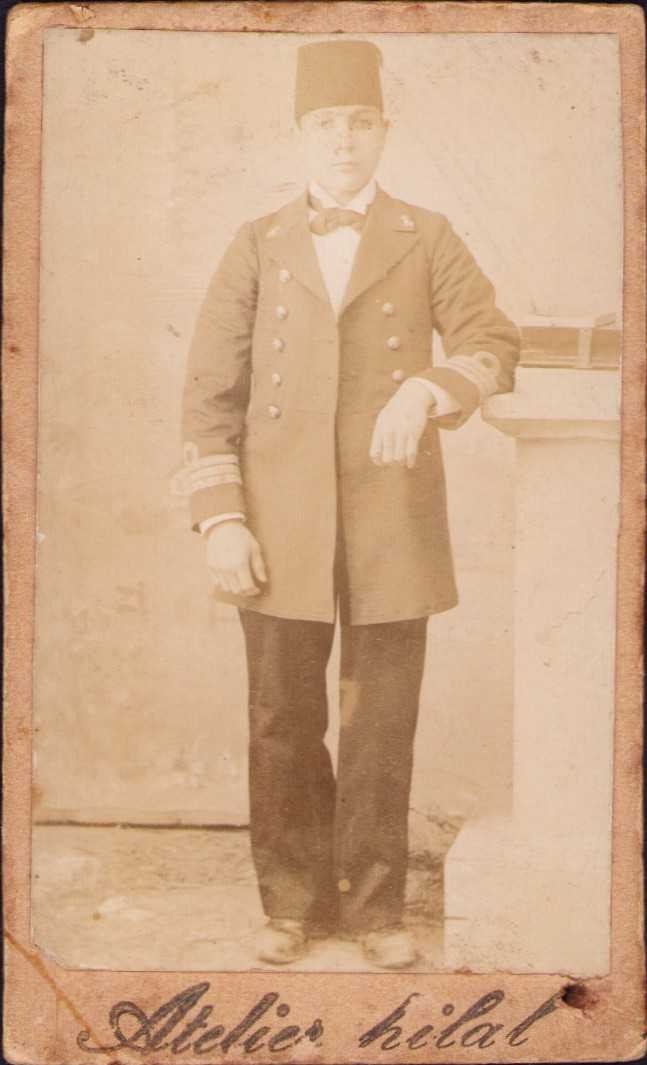 Fesli denizci Osmanlı subay, Osmanlıca Hilal Atelier damgalı kabin fotoğrafı, 5x8 cm