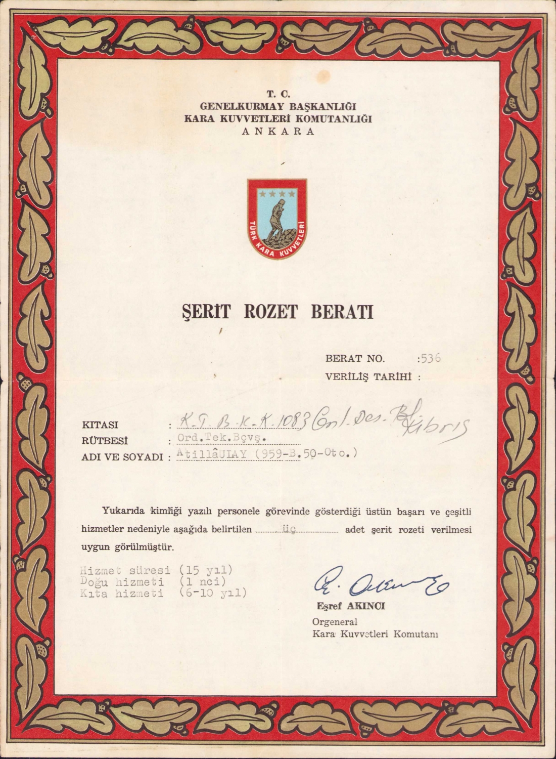 Genelkurmay Başkanlığı Kara Kuvvetleri Komutanlığı Şerit Rozet Beratı, 1959, 20x27 cm