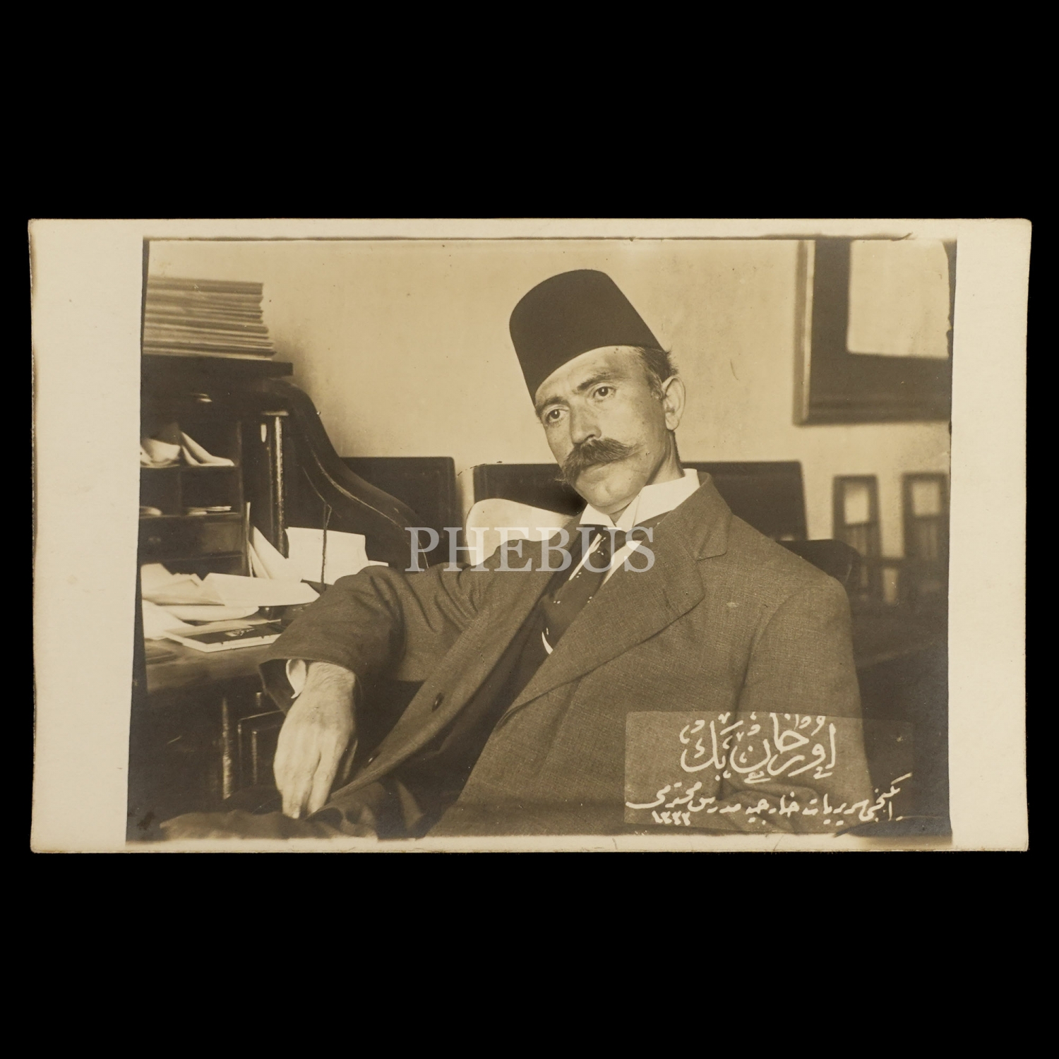 Tıbbıye-i Askeri İdadi´de ikinci seririyat-ı hariciye müderrisi Orhan Bey çalışma masası başında, 14x9 cm...