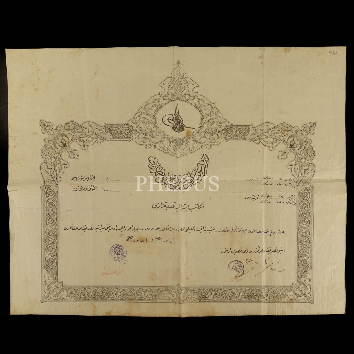 Fatih İnas Mektebi´nden mezun olan Ayşe Hanım´ın Sultan Vahdettin tuğralı diploması, 44x36 cm...