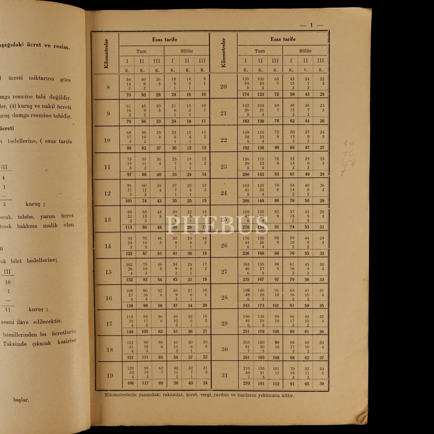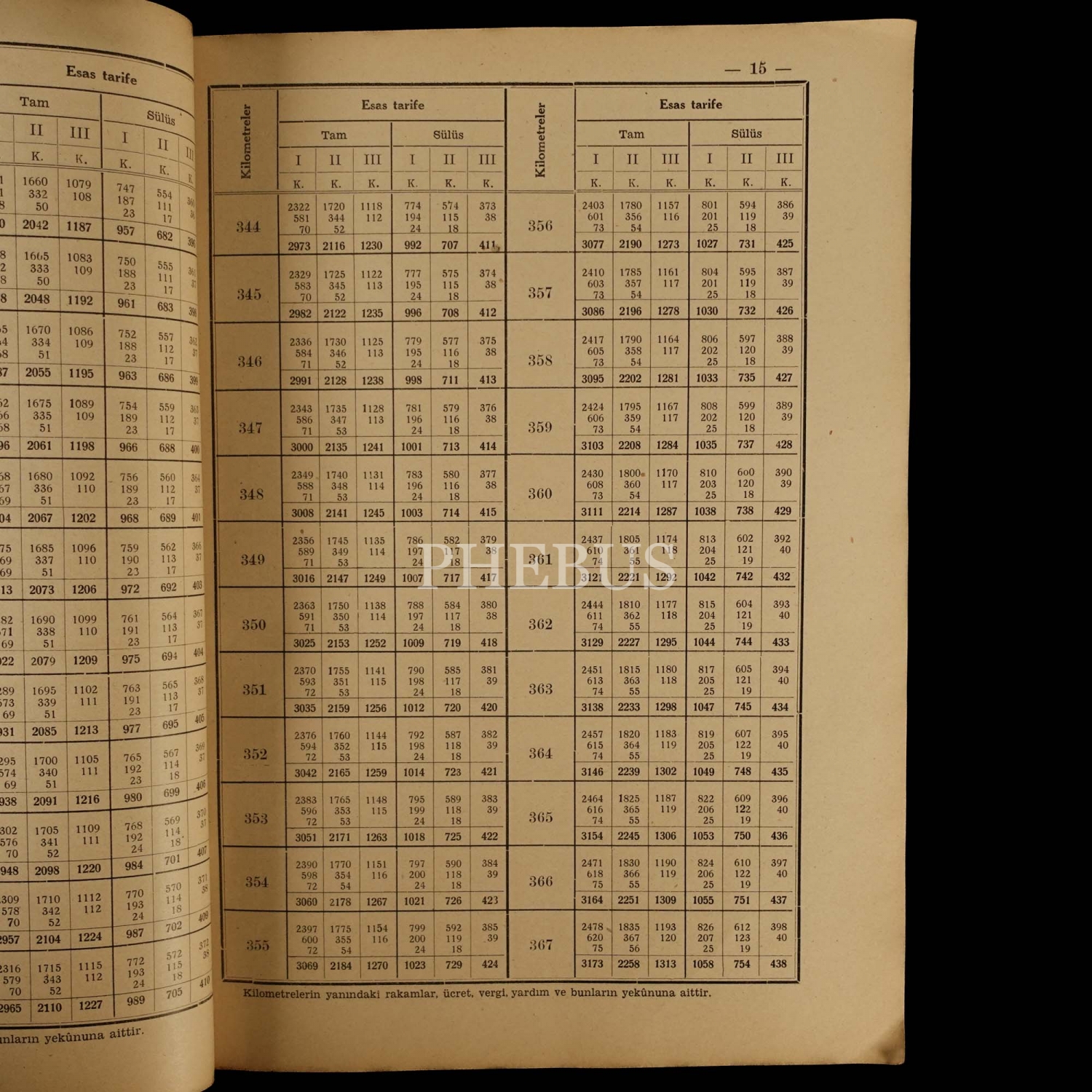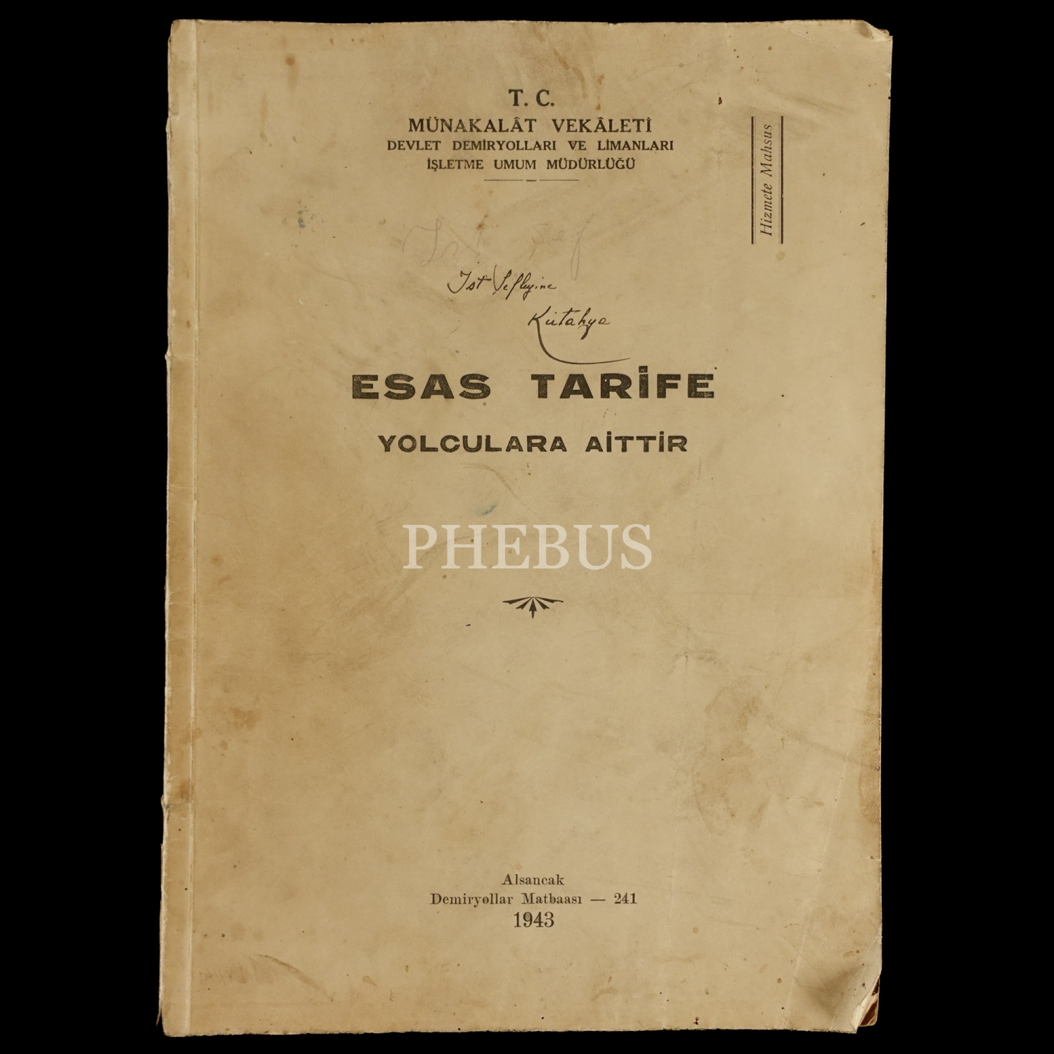 ESAS TARİFE (Yolculara Aittir), T.C. Münakalât Vekâleti Devlet Demiryolları ve Limanları İşletme Umum Müdürlüğü, 1943, Demiryollar Matbaası (Alsancak), 83 sayfa, 21x29 cm...