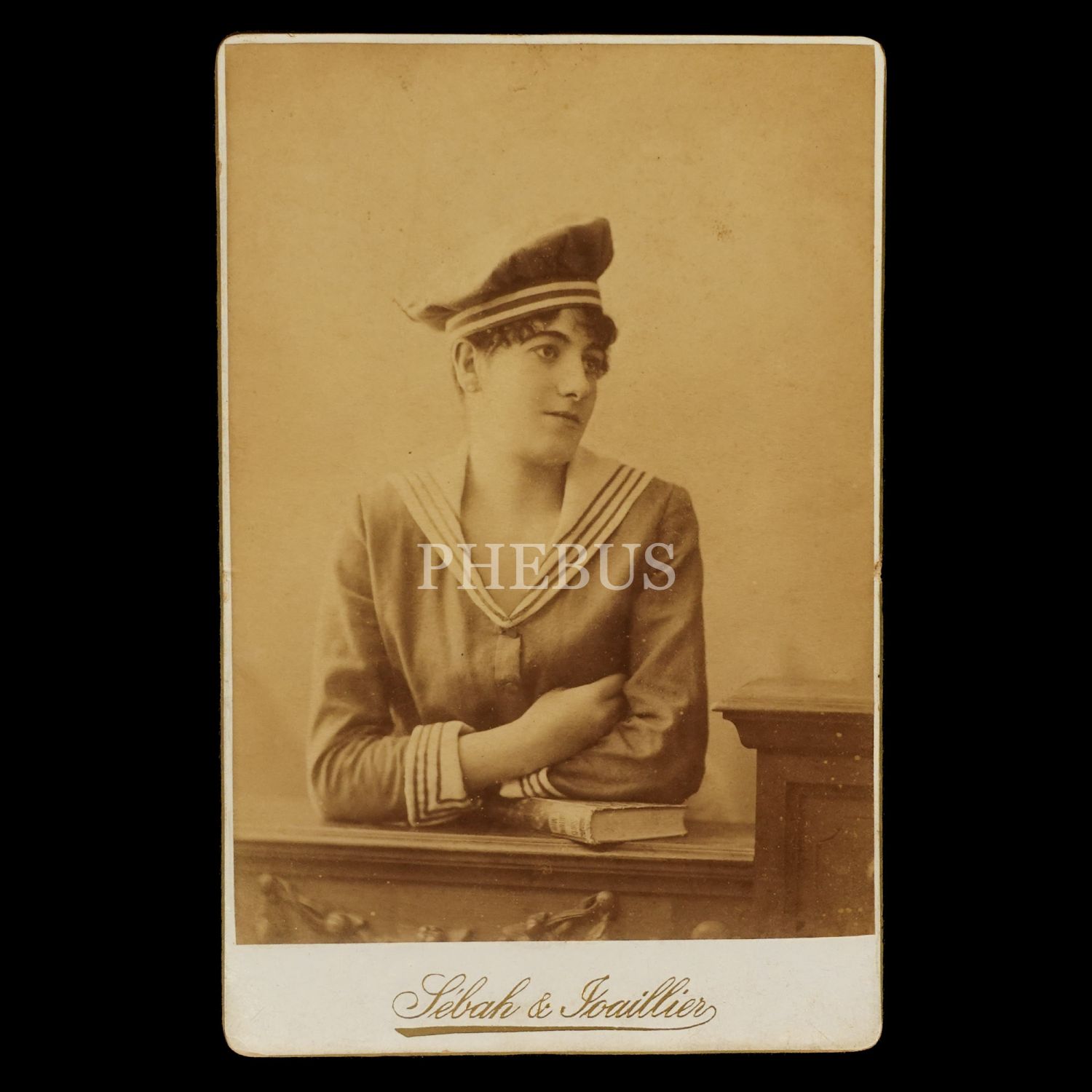 Denizci kostümlü bir hanımefendinin, Sebah&Joaillier Fotoğrafhanesi´nde (Grand Rue de Pera, Constantinople) aldırdığı kabin fotoğraf, 11x17 cm...