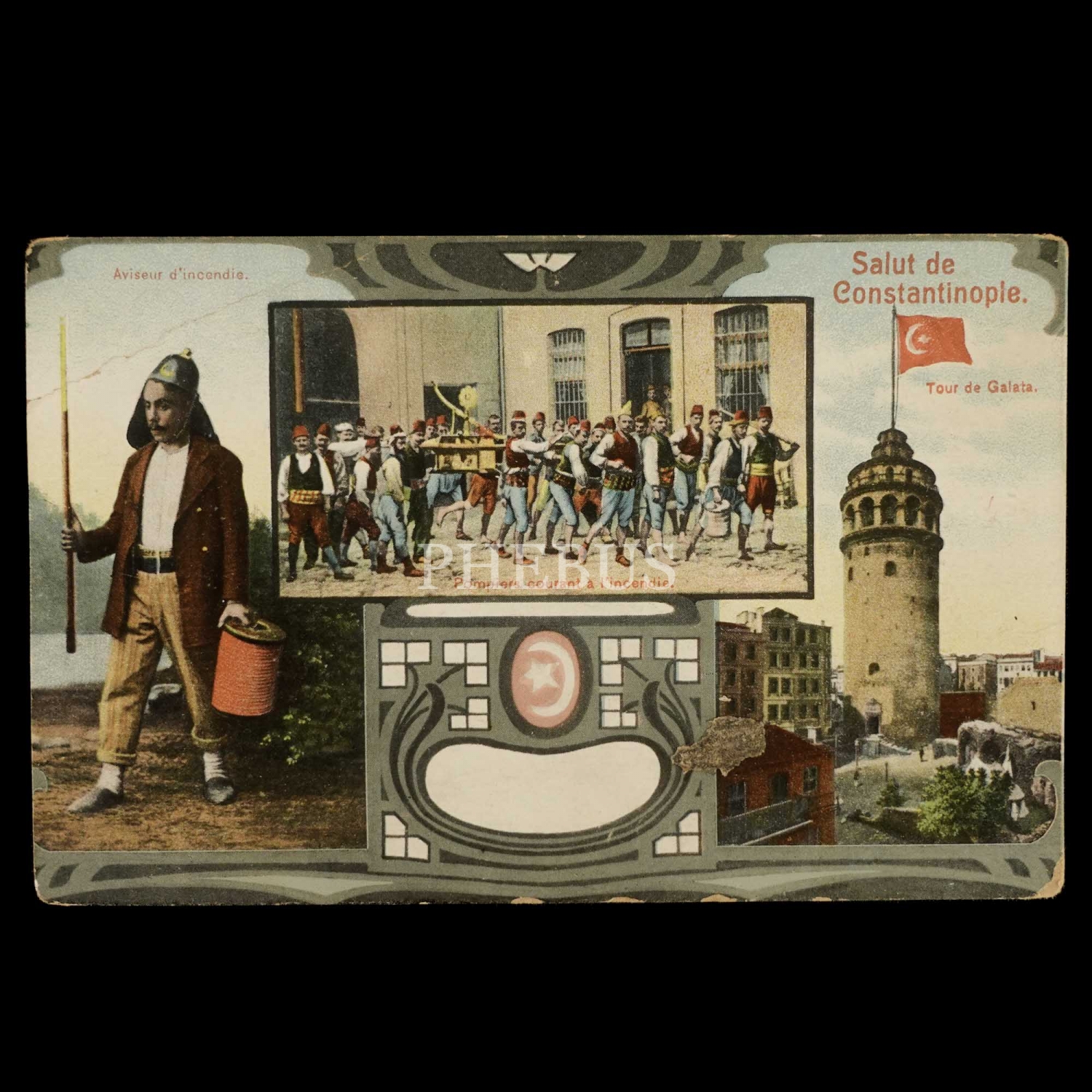 Tulumbacılar ve Galata Kulesi görselli parçalı kartpostal, "Salut de Constantinople", 14x9 cm...