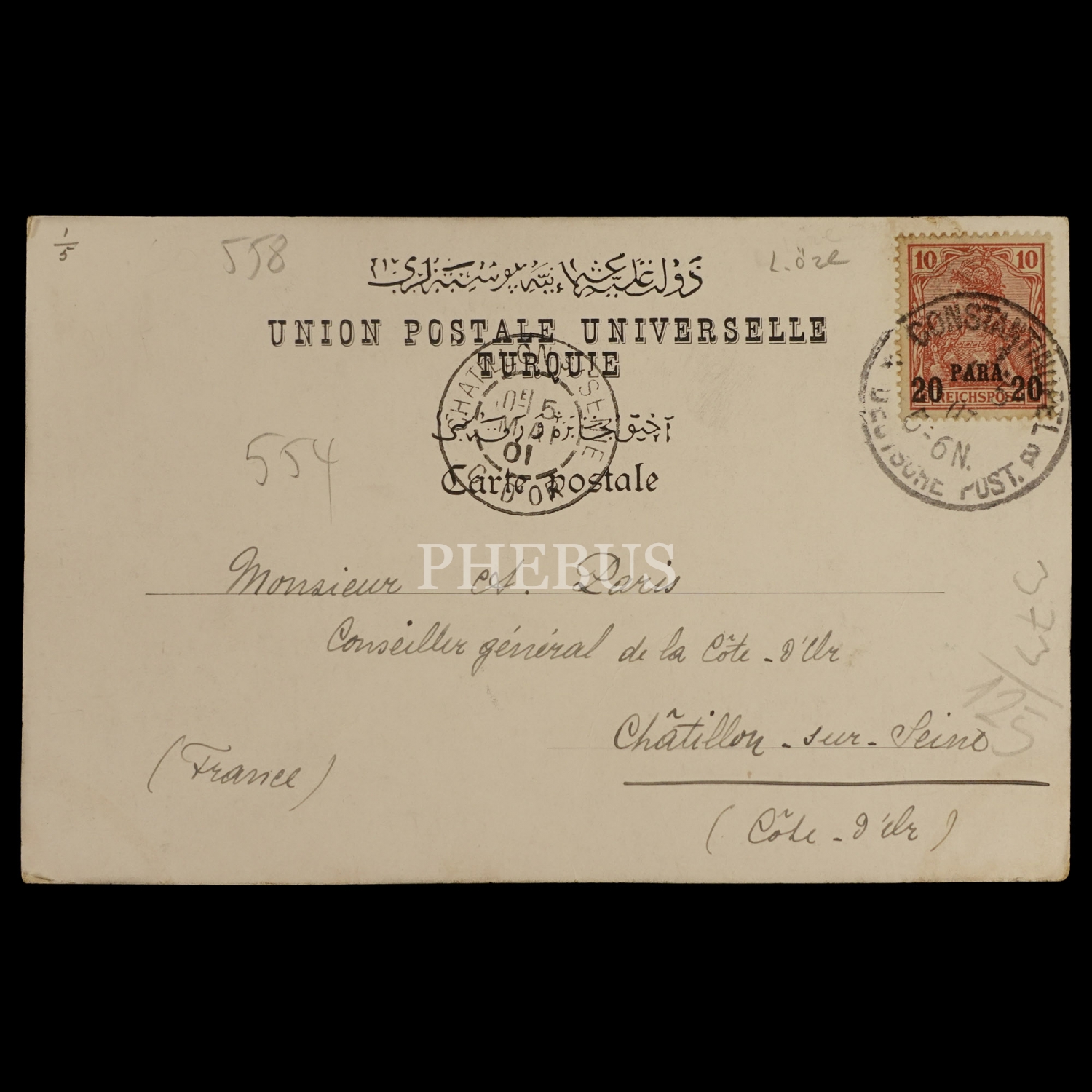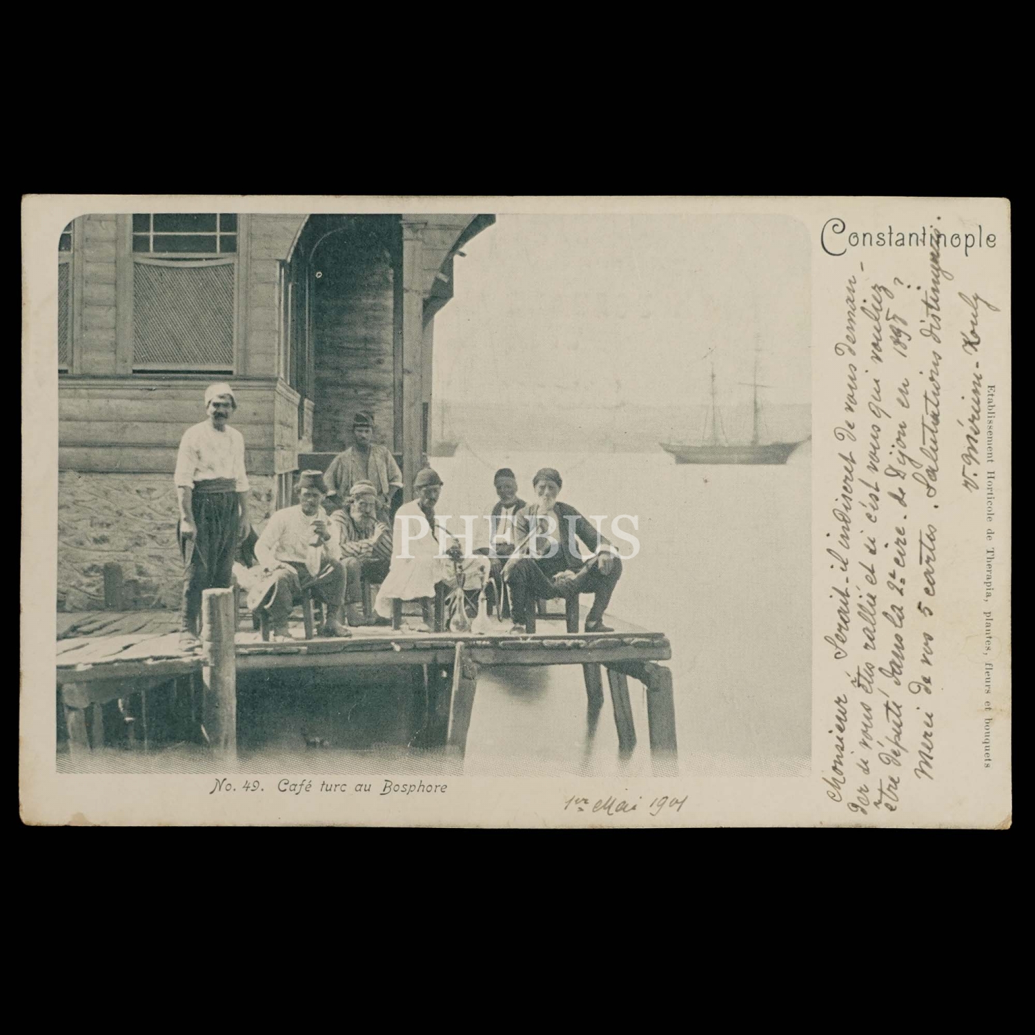 Boğaza nazır bir kahvehanede nargilelerini tüttüren Türkler, "Cafe Turc au Bosphore - Constantinople", ed. Etablissement Horticole de Therapia, plantes, fleurs et boquets, 14x9 cm...