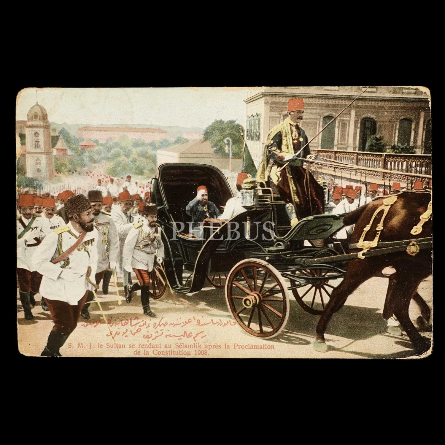 "S. M. J. le Sultan se rendant au Selamlik apres la Proclamation de la Constitation 1908" Postadan geçmiş.
