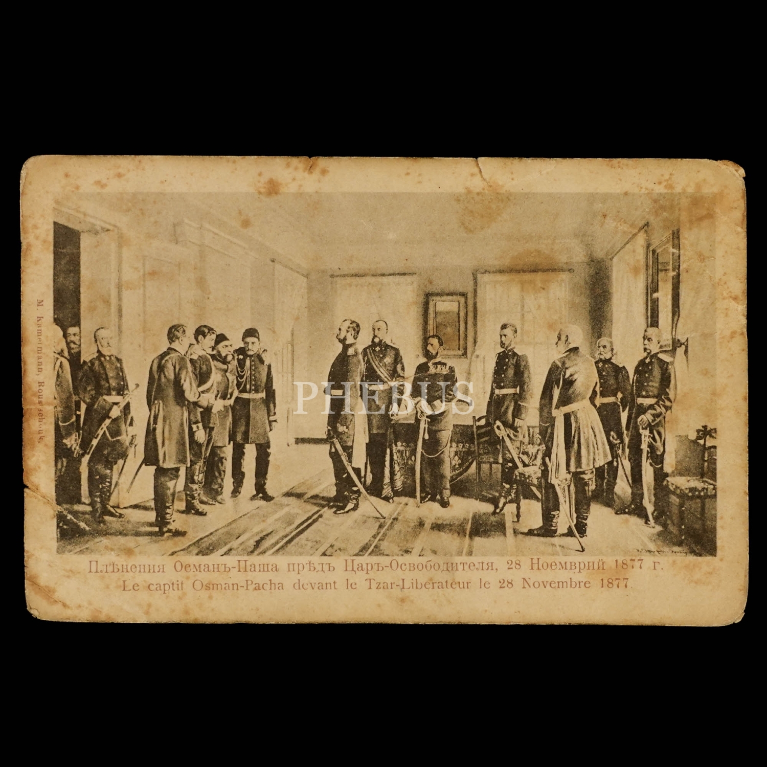 Gazi Osman Paşa, Plevne Kuşatması´nı delmek için giriştiği harekat sonrası yaralanıp esir düştükten sonra, Rus Çarı II. Aleksandr´ın huzuruna getiriliyor, 28 Kasım 1877, ed. M. Kamermann, Rusçuk, 14x9 cm...