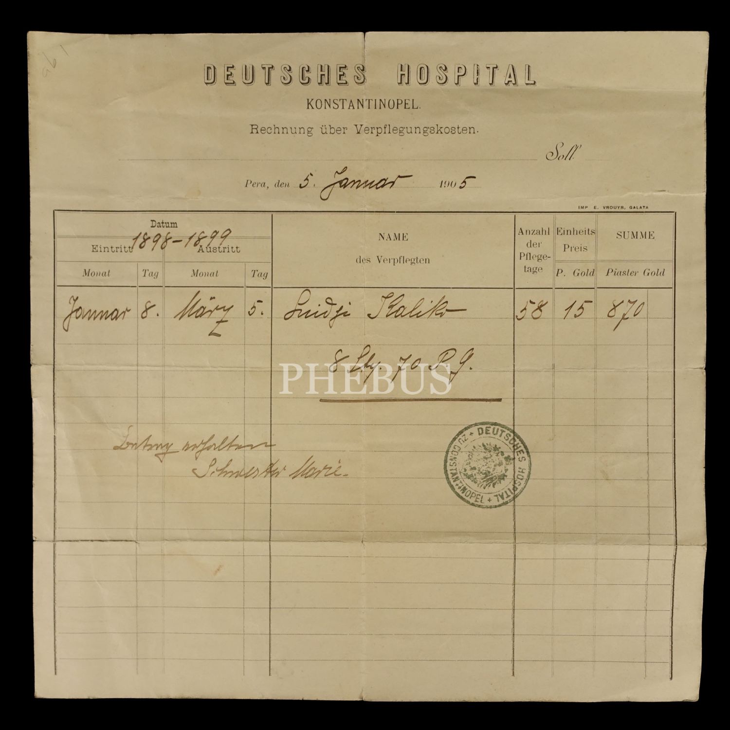 Deutsches Hospital (Alman Hastanesi) - Konstantinopel antetli, 1905 tarihli makbuz, 25x25 cm...