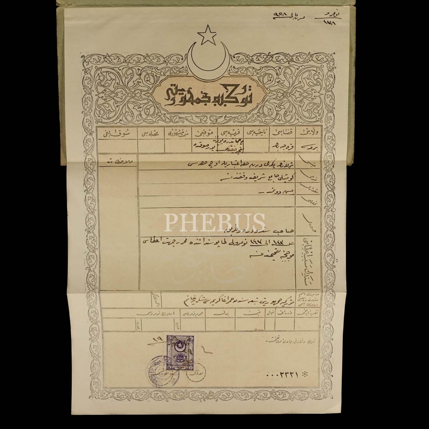 Ay yıldızlı özel muhafazası içinde Türkiye Cumhuriyeti tapu senedi, 46x23 cm...