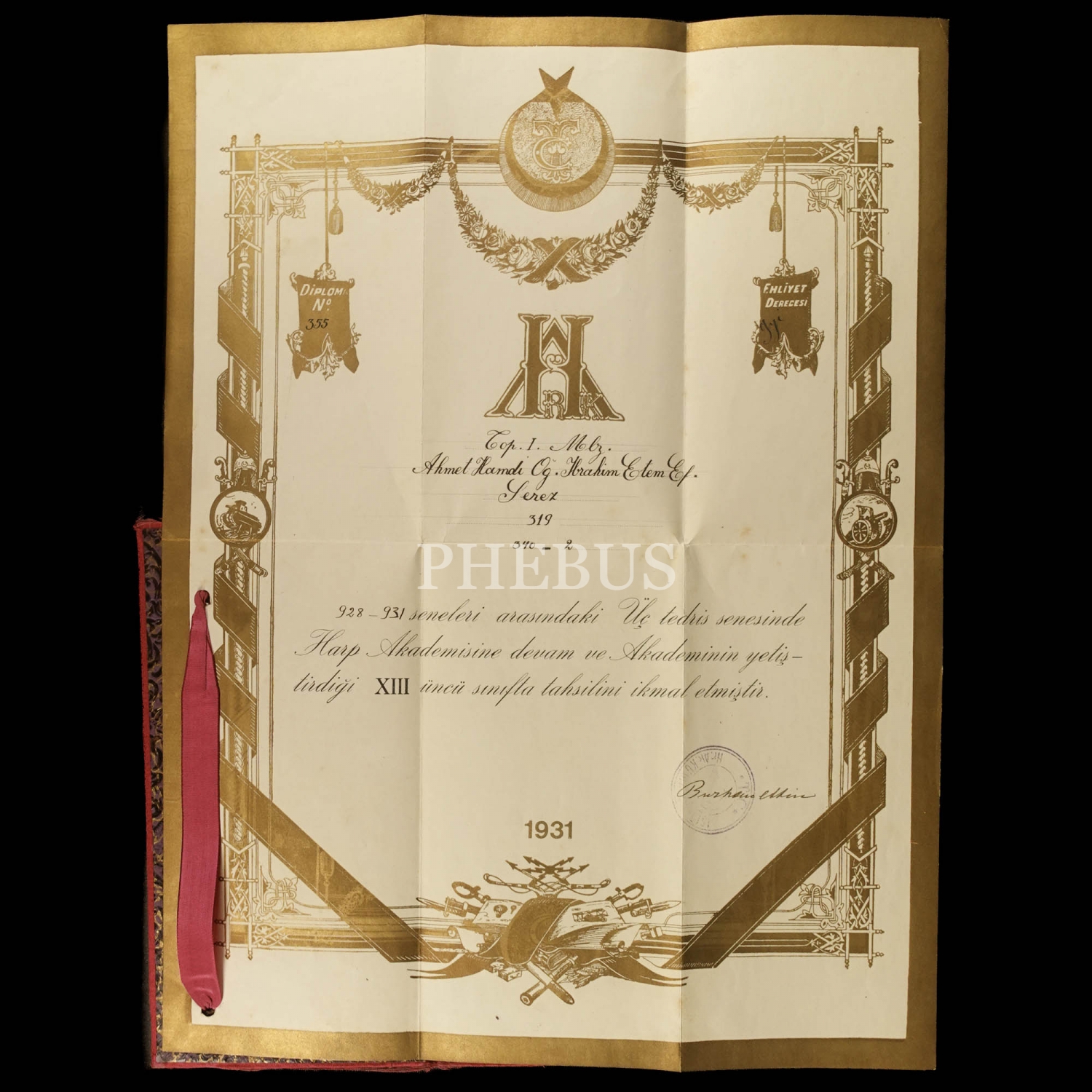 1928-1931 yılları arasında Harp Akademisi´nde öğrenim gören Ahmed Hamdi oğlu İbrahim Ethem Efendi´nin diploması, "H.A." (Harp Akademisi) inisiyalli ve ay-yıldız görselli orijinal kadife cildinde, cilt 12x22 cm, diploma 31x41 cm...