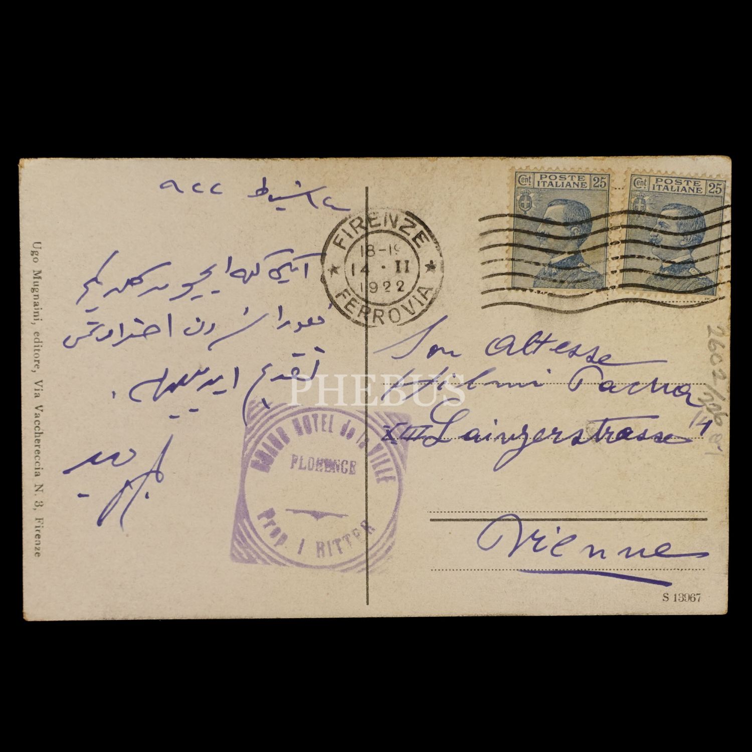 Kartpostalın arka yüzünde, "İki gün için geldiği Floransa´dan ihtiramatımı takdim ederim" mektubu yer almaktadır.