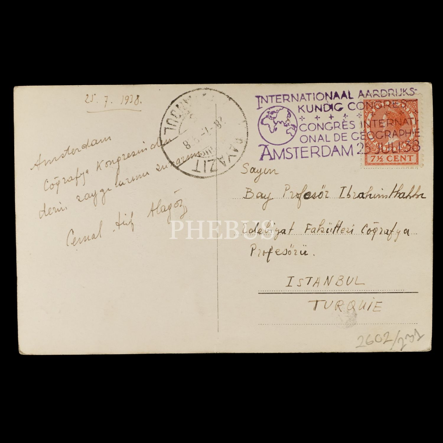 Cumhuriyet döneminin ilk coğrafyacılarından Cemal Arif Alagöz´den meslektaşı İbrahim Hakkı Akyol´a gönderilmiş, selam ve saygı mektuplu kartpostal, 1938 Amsterdam Uluslararası Coğrafya Kongresi özel kaşeli, 14x9 cm...