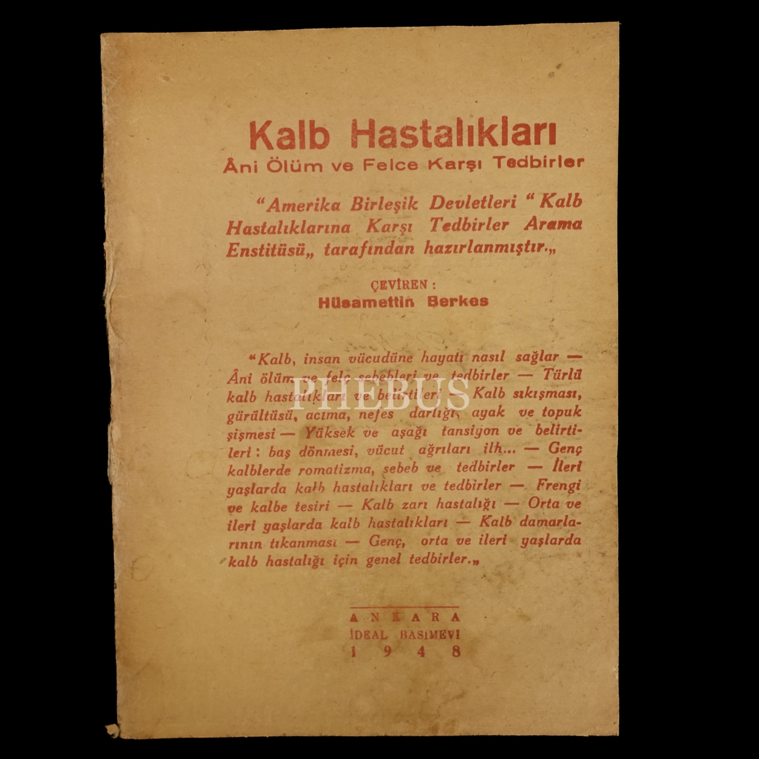 KALB HASTALIKLARI (Âni Ölüm ve Felce Karşı Tedbirler), Amerika Birleşik Devletleri Kalb Hastalıklarına Karşı Tedbirler Arama Enstitüsü, (çeviren: Hüsamettin Berkes), 1948, İdeal Basımevi, 35 sayfa, 13x17 cm...