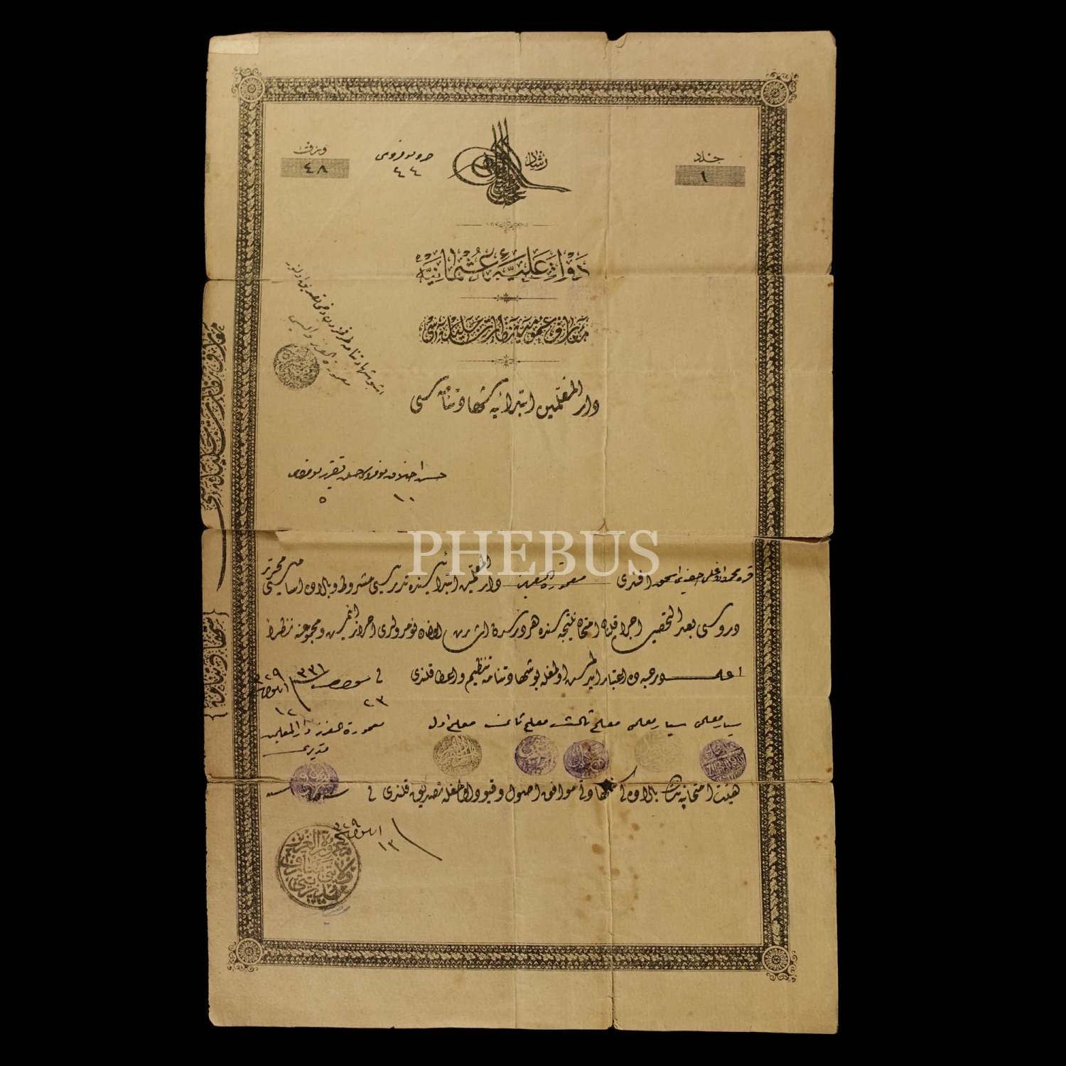 Ma‘mûretü´l-Azîz (Elazığ) Darülmuallimin İptidaiyesi´nden mezun olan İshak Efendi´nin Sultan Mehmed Reşad tuğralı diploması, 12 Eylül 1329, 21x34 cm...