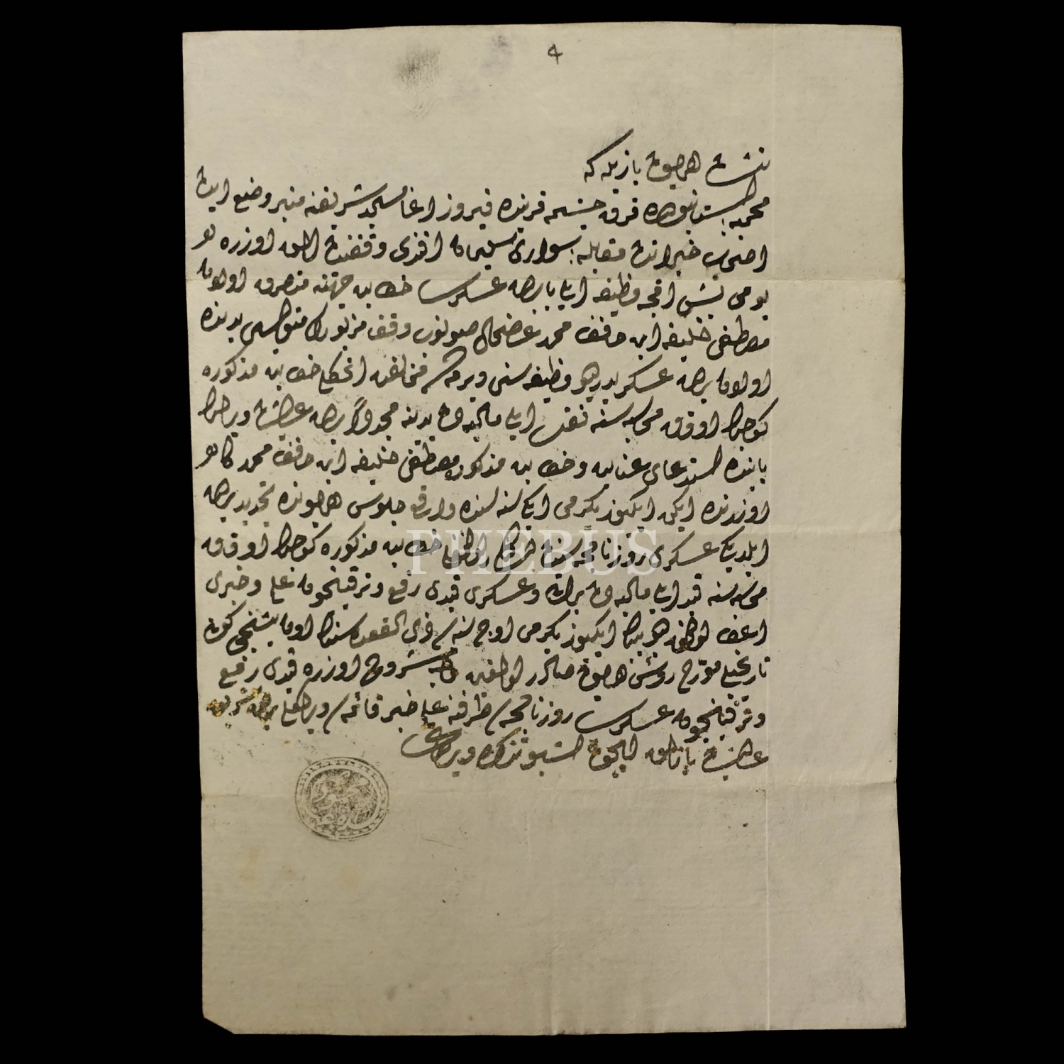 Süvari Mukabelecisi Süleyman Efendi´nin İstanbul´da Kırkçeşme yakınındaki Firuz Ağa Mescidi´nde kurduğu vakıftan hatiplik ücreti alan Mustafa Halife´nin (Hafız Mustafa Efendi) elindeki beratın askerî olmasından dolayı vakıf mütevellisi ücretini vermek istemediğinden, beratının askerî kaydının iptal edilerek eline Maliye´den yeni bir berat verilmesi hakkında kaleme alınmış evrak, 15 Zilkade 1223 (2 Ocak 1809), 11x15 cm...