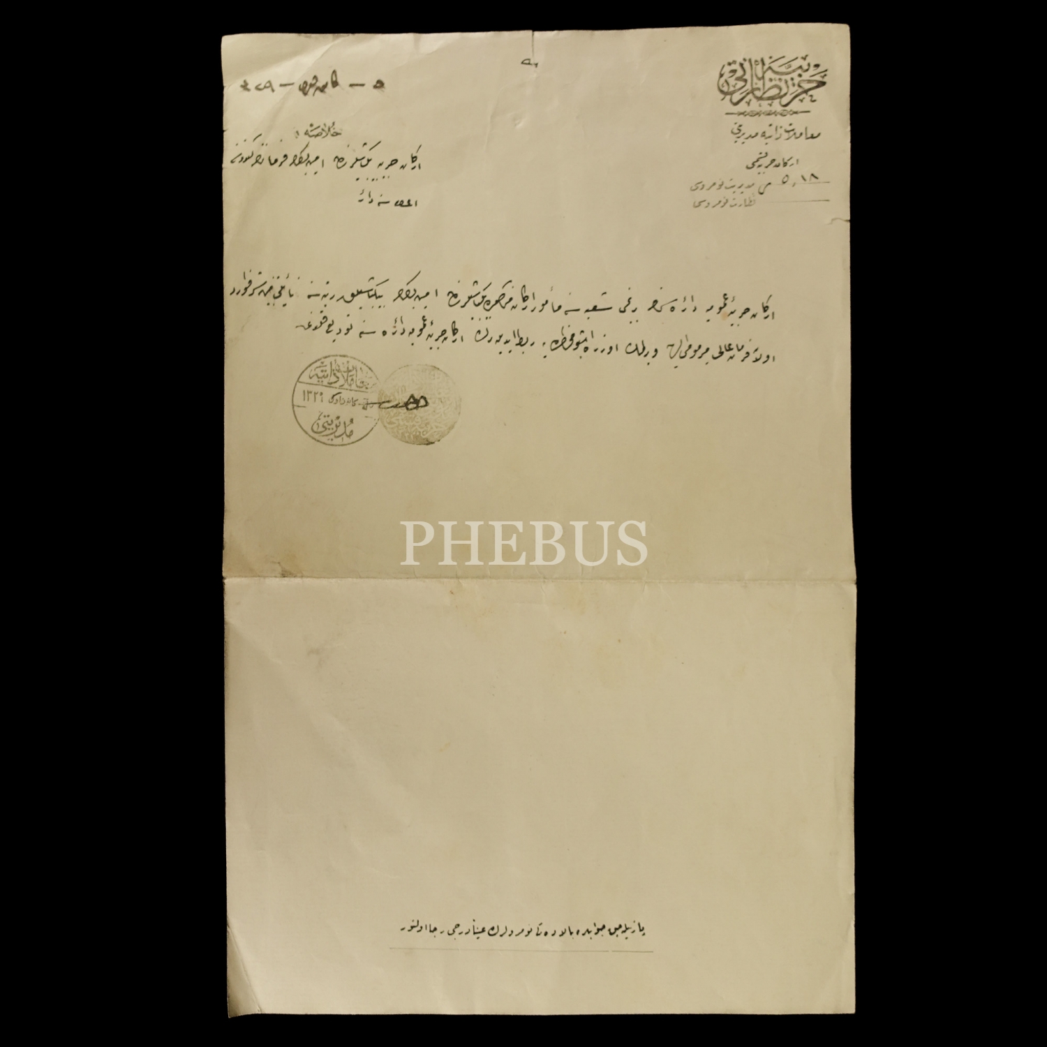 Harbiye Nezareti Malumat-i Zabtiye Müdüriyeti antetli, Erkan Harbiye-i Umumiye Dairesi´nden Emin Bey´in Binbaşı rütbesine tevcih edildiğine dair kaleme alınmış beratın kendisine teslim edilidiğini gösterir evrak, 1329, 21x32 cm...
