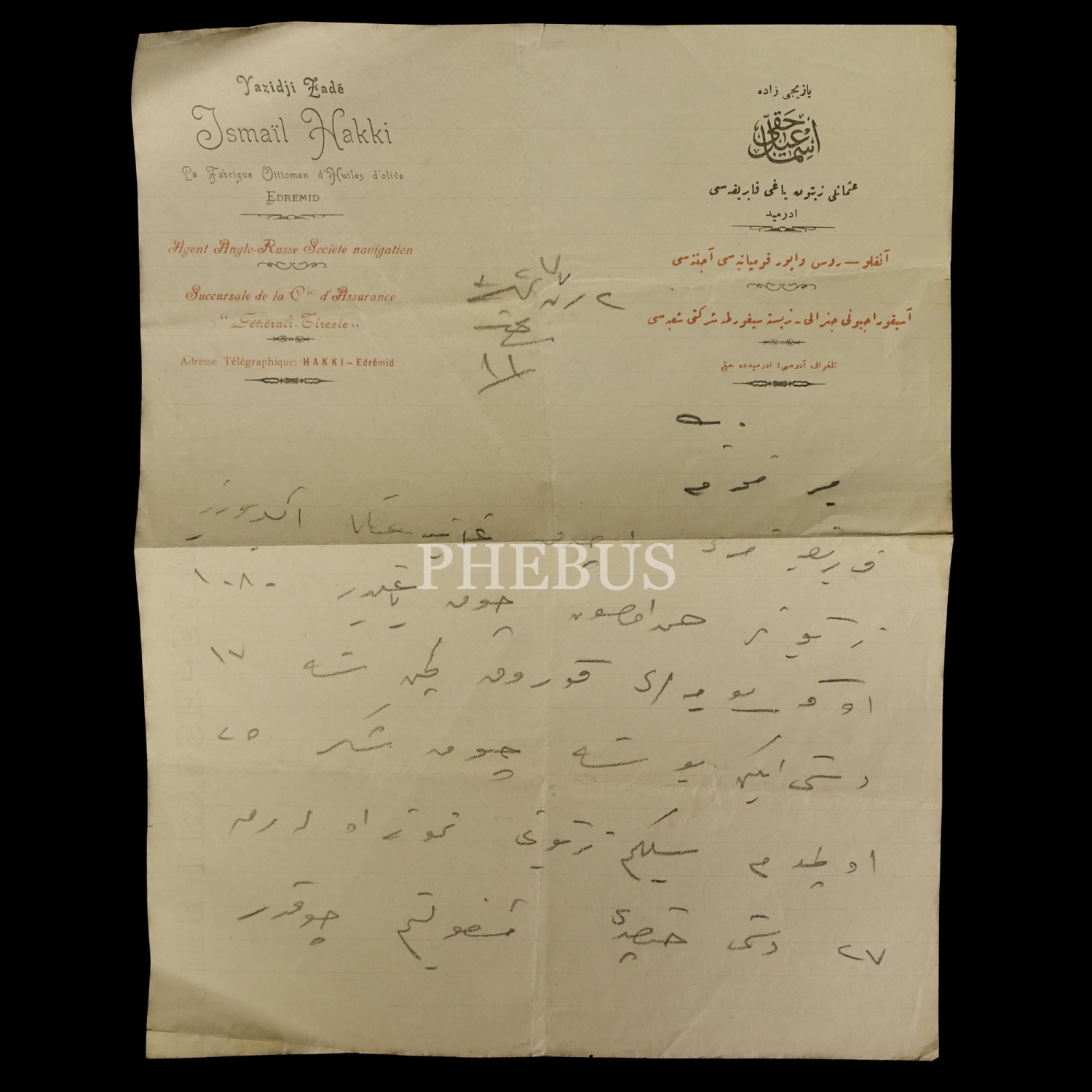 "Yazıcızade İsmail Hakkı Osmanlı Zeytinyağı Fabrikası" antetli fatura, 1327, 21x27 cm...